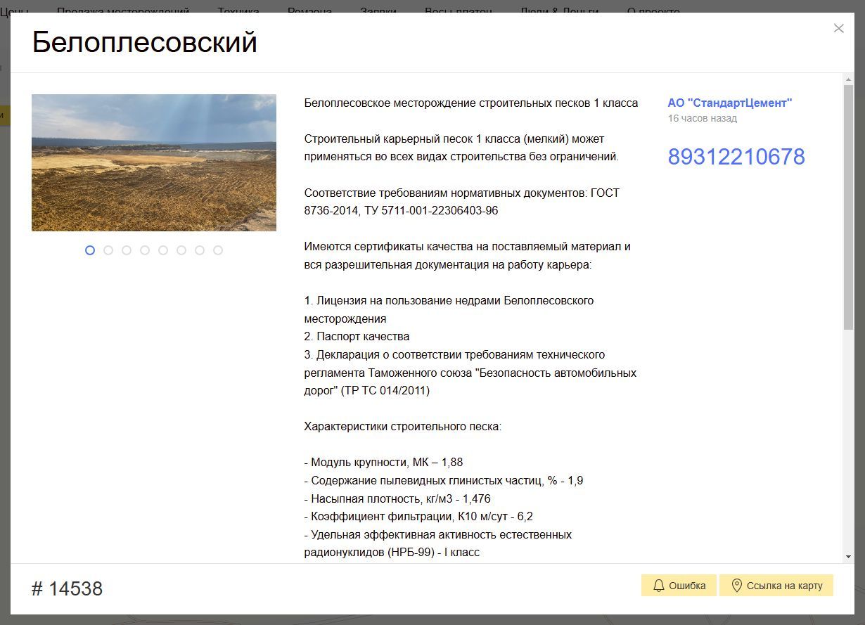 Белоплесовское месторождение строительных песков 1 класса Строительный карьерный песок 1 класса (мелкий) может применяться во всех видах...