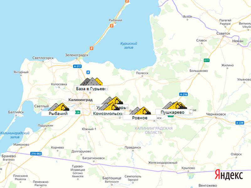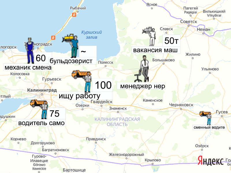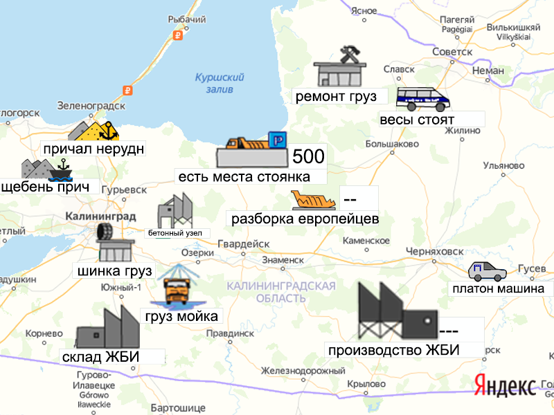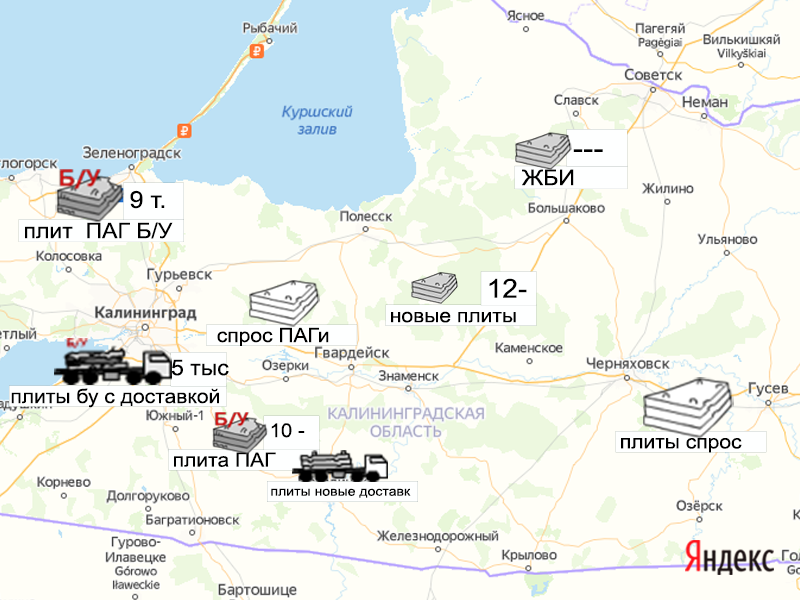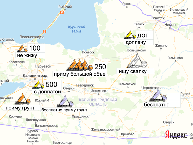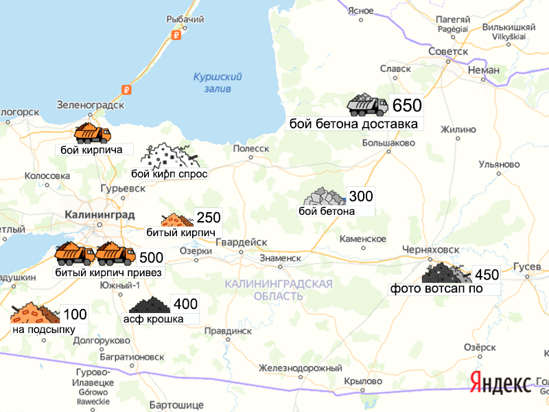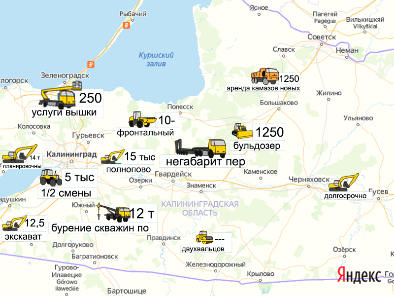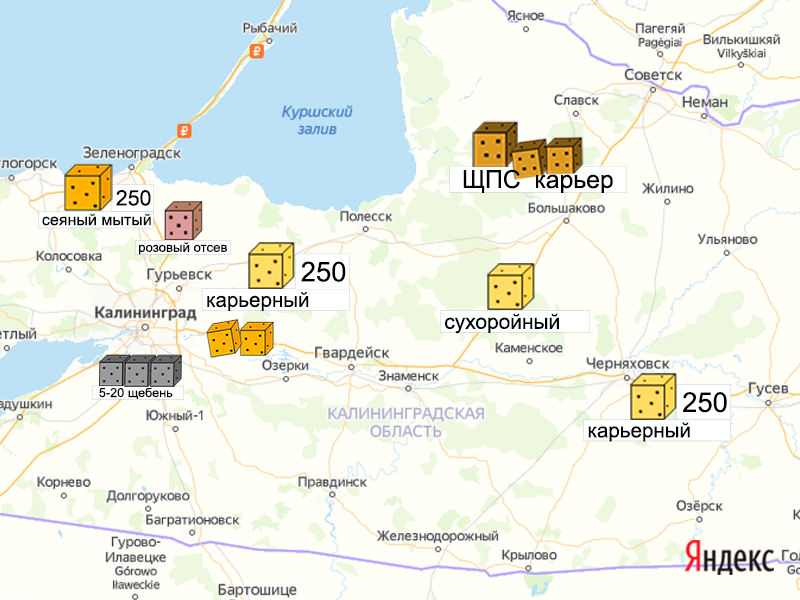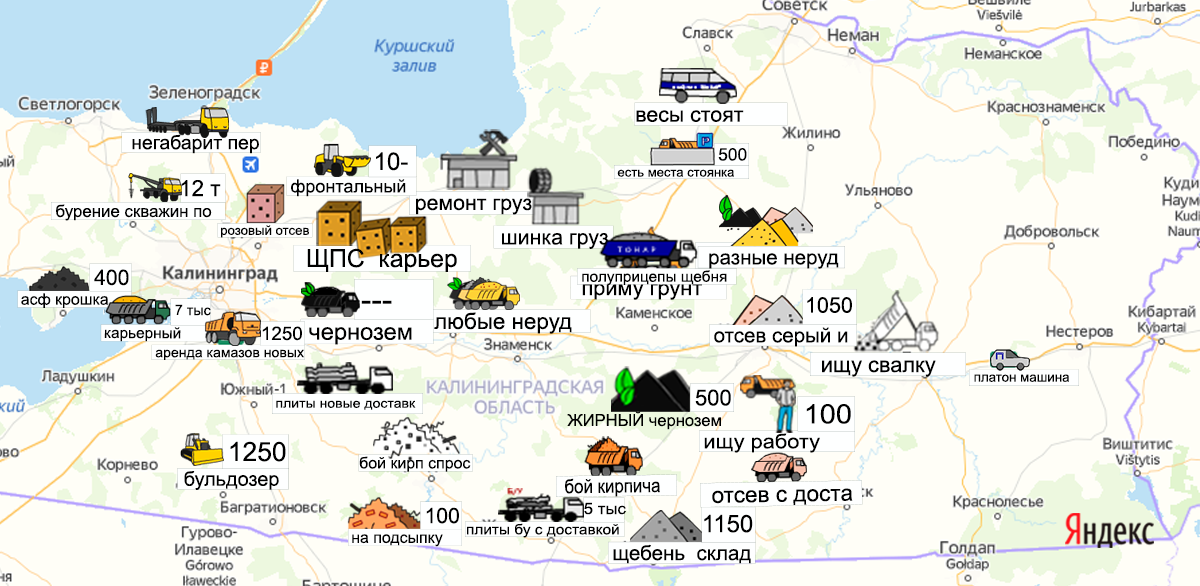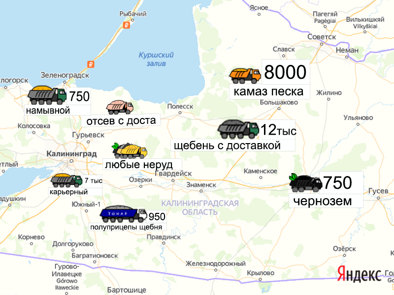 Песок, щебень, техника: объявления на карте в Калининградской области