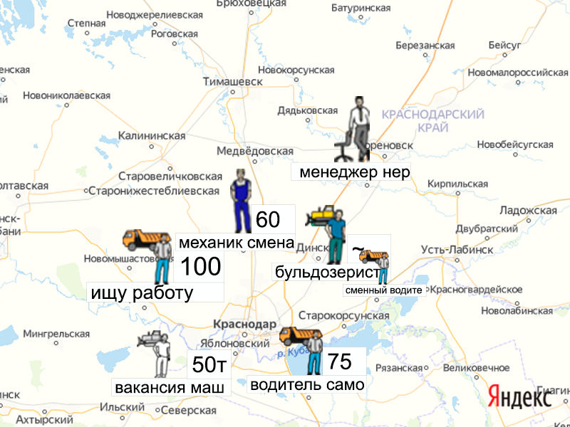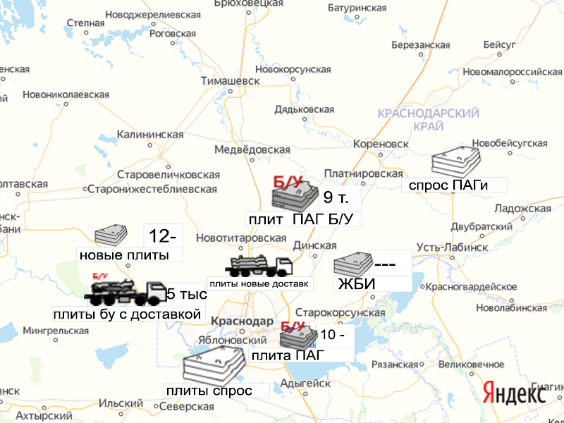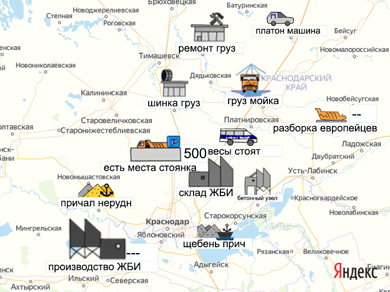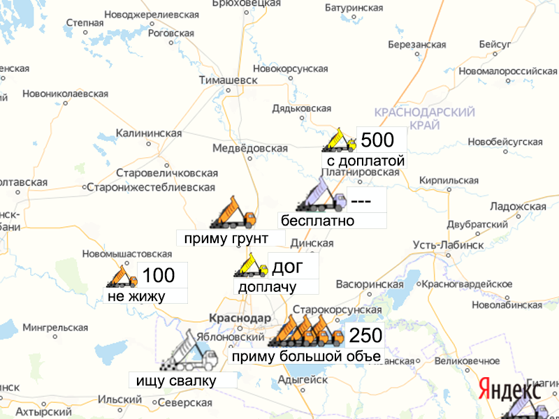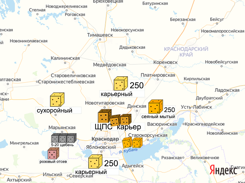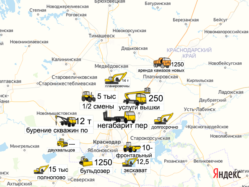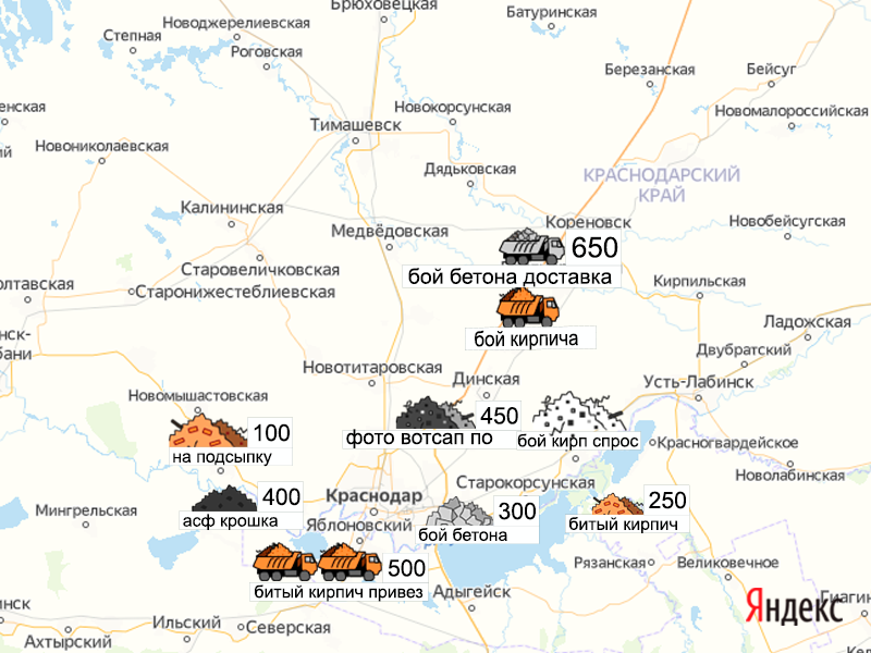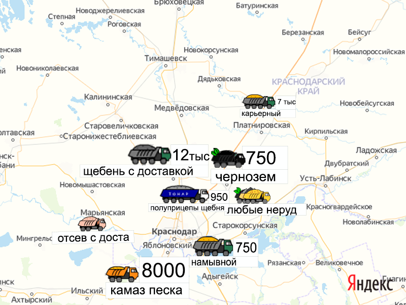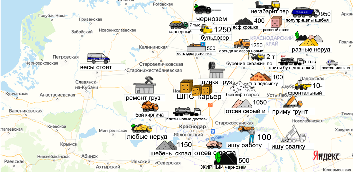 Песок, щебень, техника: объявления на карте в Краснодарском крае