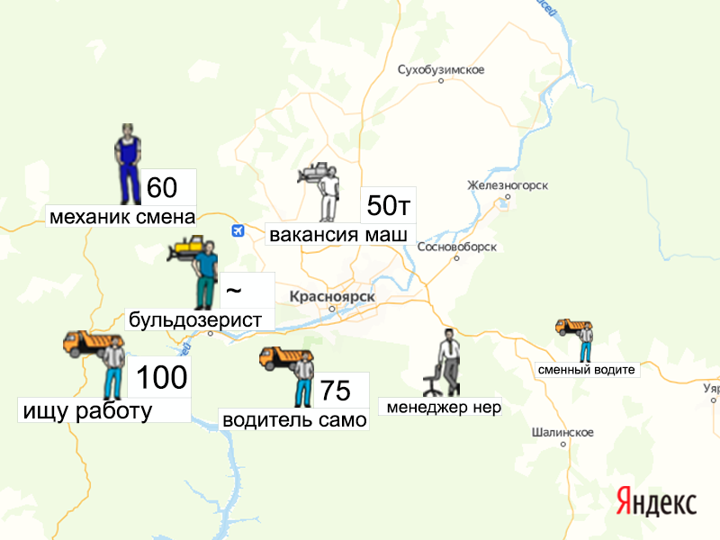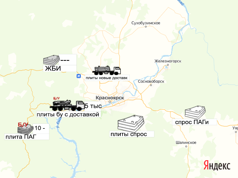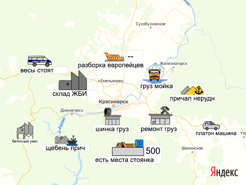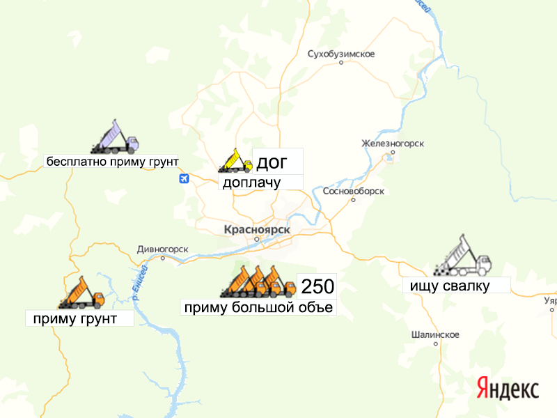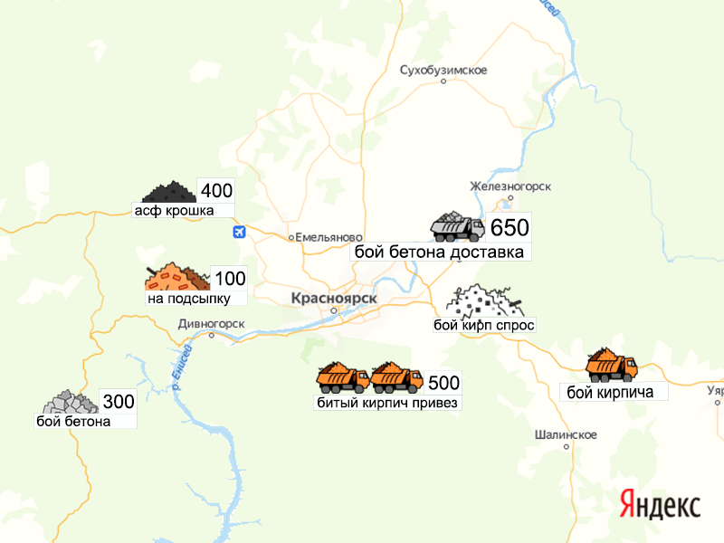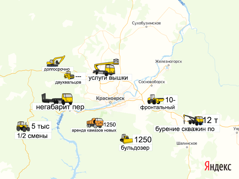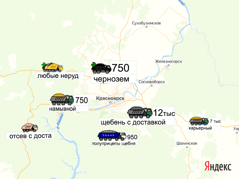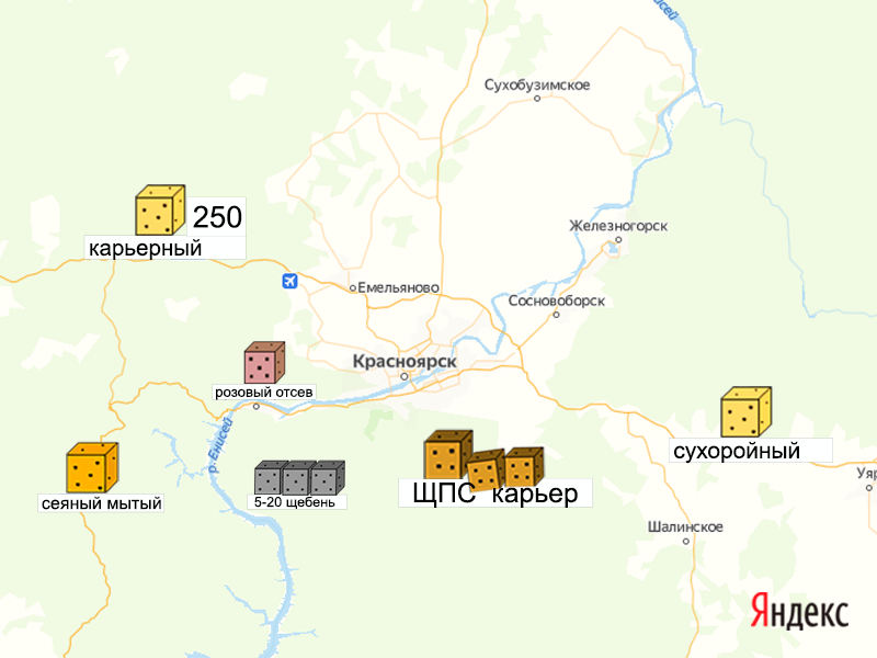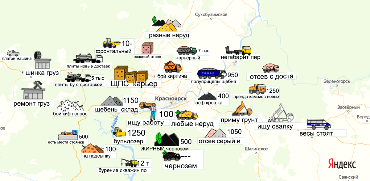 Песок, щебень, техника: объявления на карте в Красноярском крае