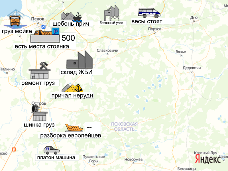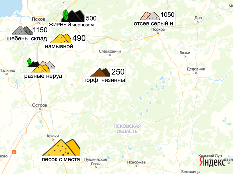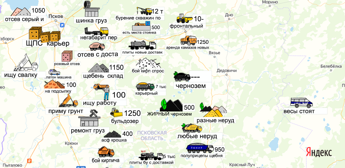 Песок, щебень, техника: объявления на карте в Псковской области