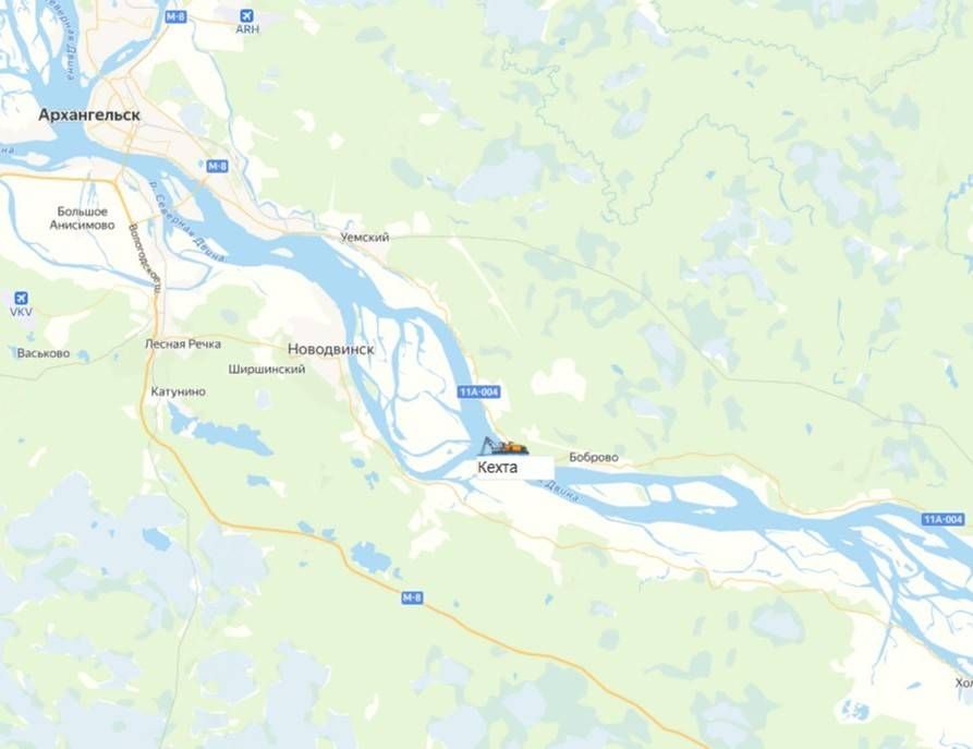Архангельская область, Приморский район, у правого берега о. Кехотский, в русле р. Сев. Двины на 32-36 км судового хода от г. Архангельск