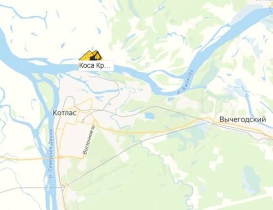 Архангельская область, Котласский район, в 1,1 км к ЮВ от пос. Круглица, в русле р. Вычегда