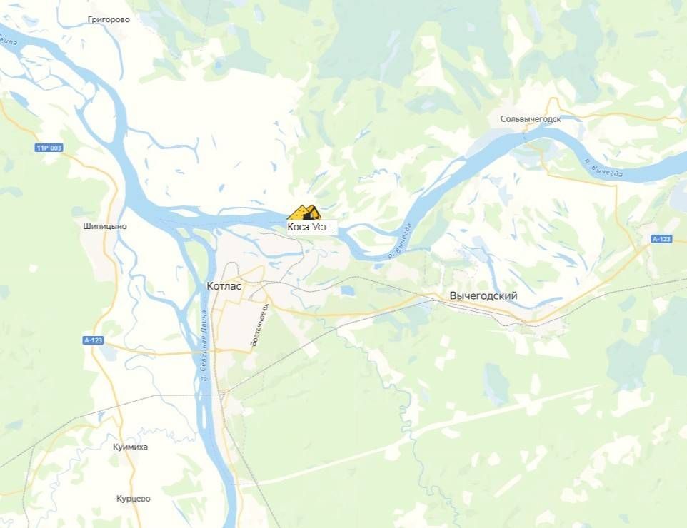 Архангельская область, Котласский район, в 8,7 км к ЮЗ от г. Сольвычегодск, на косе у левого берега р. Вычегда