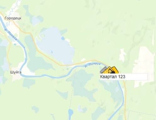Архангельская область, Пинежский район, в 12,7 км к ЮВ от д. Городецк, в 1,6 км С впадения в р. Пинегу её правого притока р. Бол. Кечкомы, в кв. 123 Сурского л/ва Сурского л-за