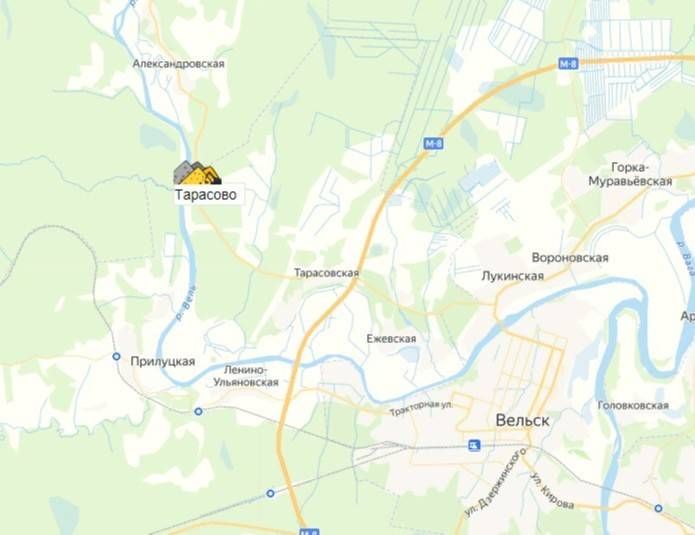 Архангельская область, Вельский район, в 5,6 км СЗ г.Вельска, в 2,3 км СЗ д.Тарасовская