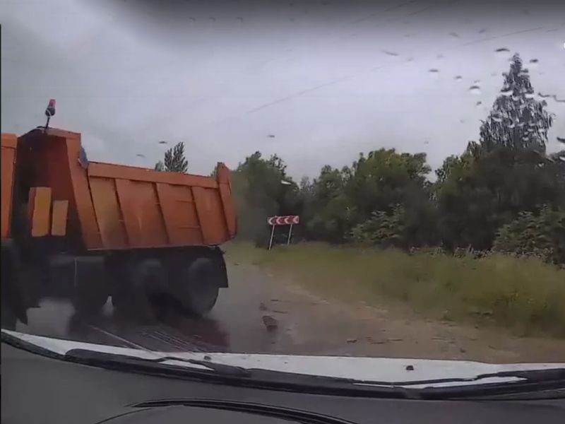 На скользкой дороге КАМАЗ и чуть не выехал н...