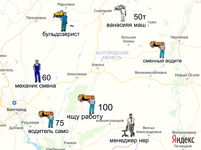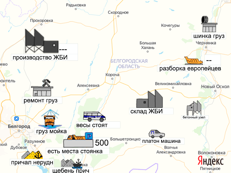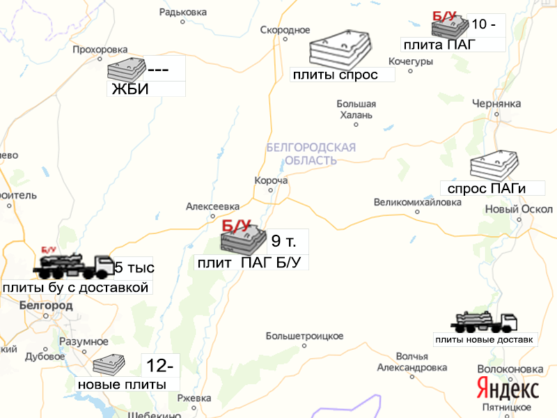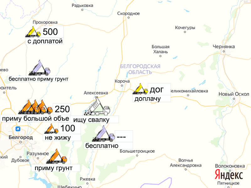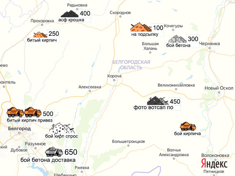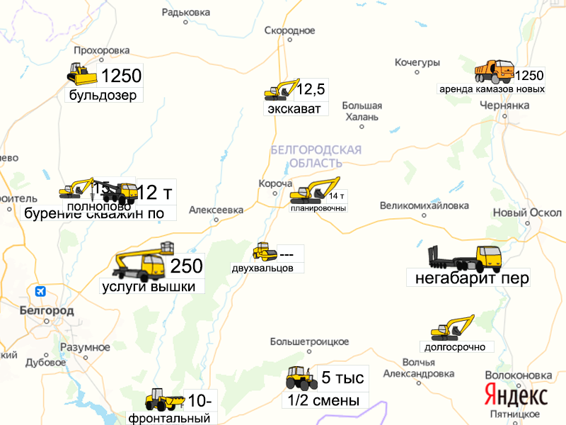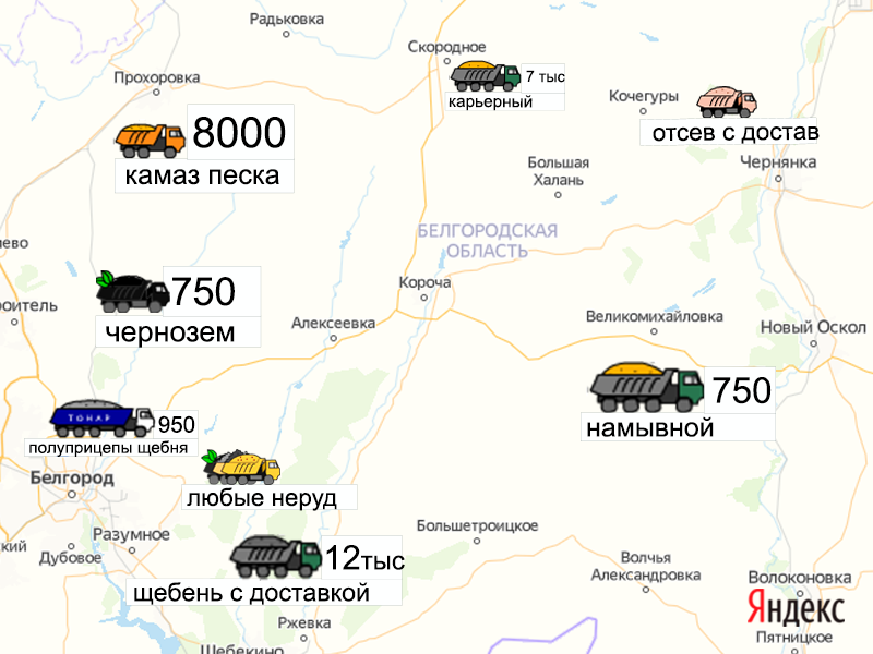 Песок, щебень, техника: объявления на карте в Белгородской области