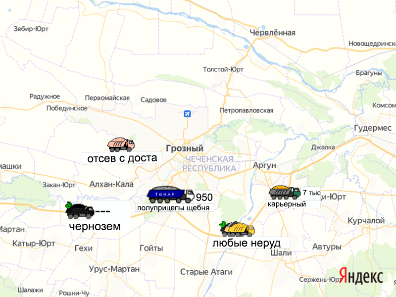 Давайте сделаем для таких покупателей удобным процесс заказа нерудных с доставкой. Эта карта для них. Добавляйте свои самосвалы на карту, сколько стоит какая машина с учетом конкретного места и качества материала и объема кузова.