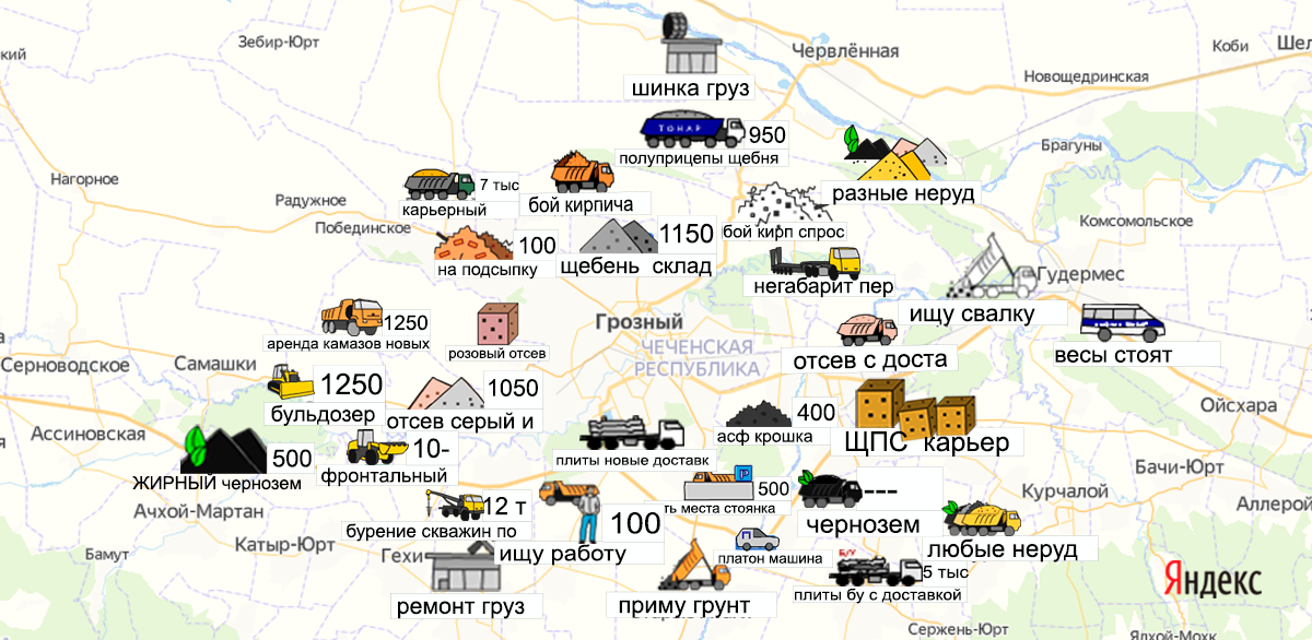 - текст 2: Тут могут быть предложения от карьеров и от всех пользователей. Главное условие - конкретный объем, конкретное качество материала (возможно фото), конкретная цена, конкретное место самовывоза. Общие перечисления всех материалов на карте будут неинформативны и модератор их сразу удалит.