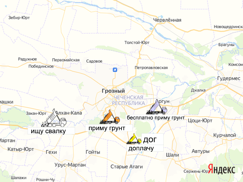 Песок, щебень, техника: объявления на карте в Чечне