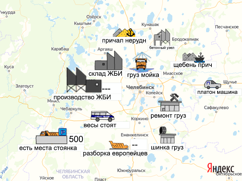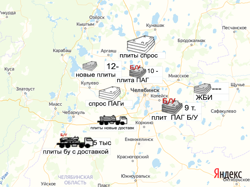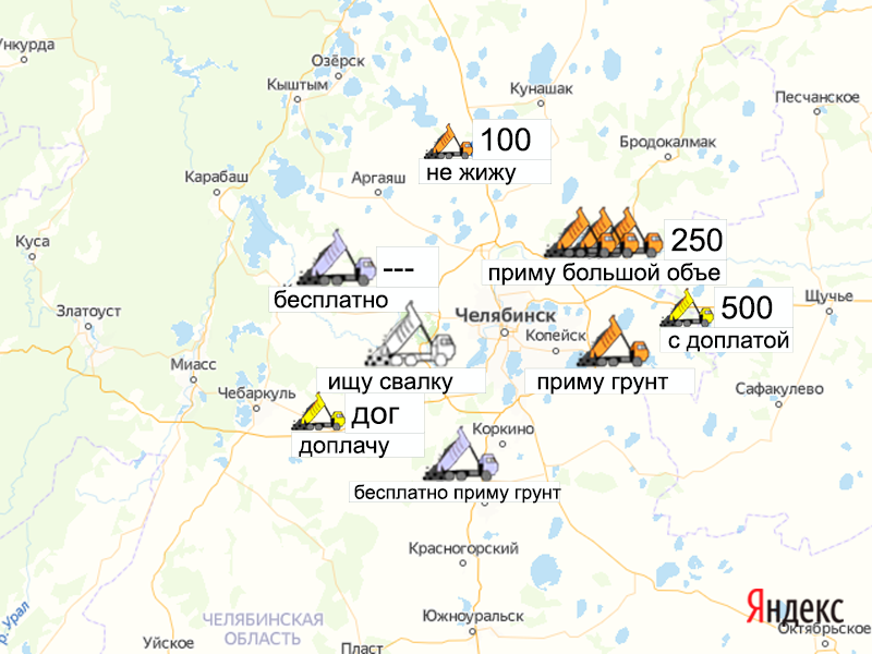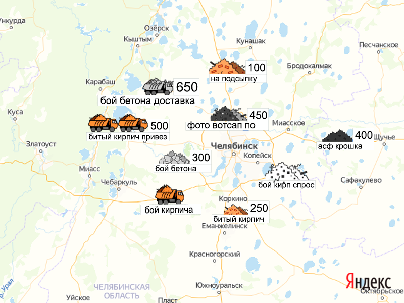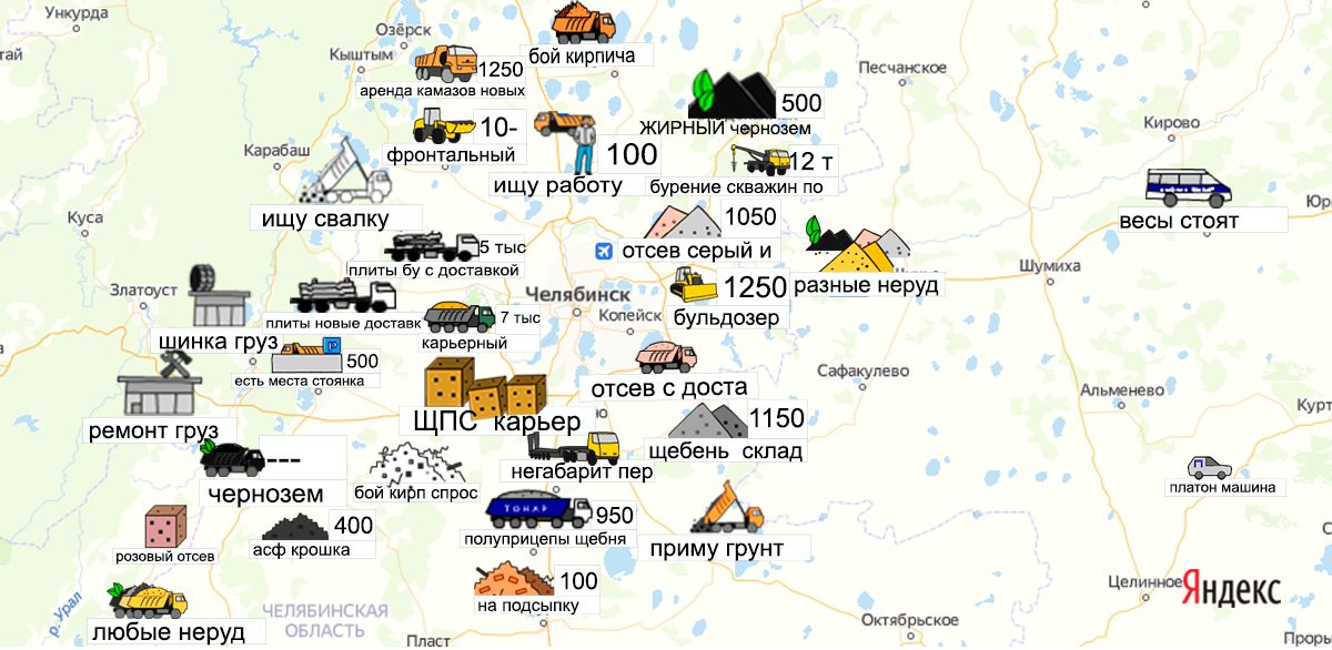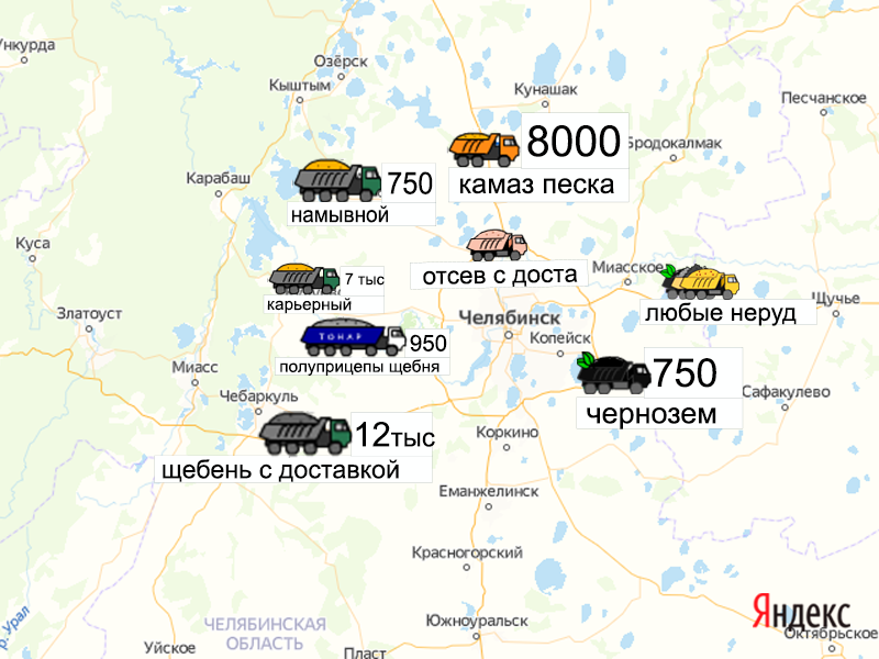Песок, щебень, техника: объявления на карте в Челябинской области