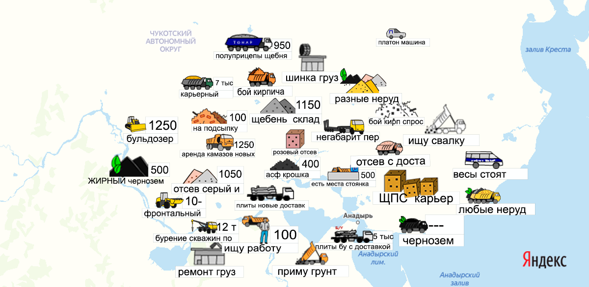 - текст 2: Тут могут быть предложения от карьеров и от всех пользователей. Главное условие - конкретный объем, конкретное качество материала (возможно фото), конкретная цена, конкретное место самовывоза. Общие перечисления всех материалов на карте будут неинформативны и модератор их сразу удалит.