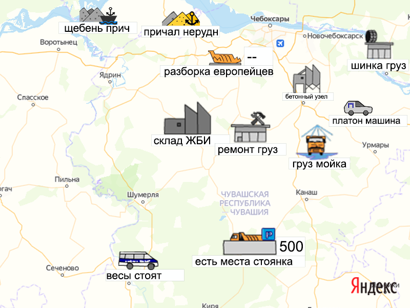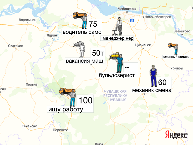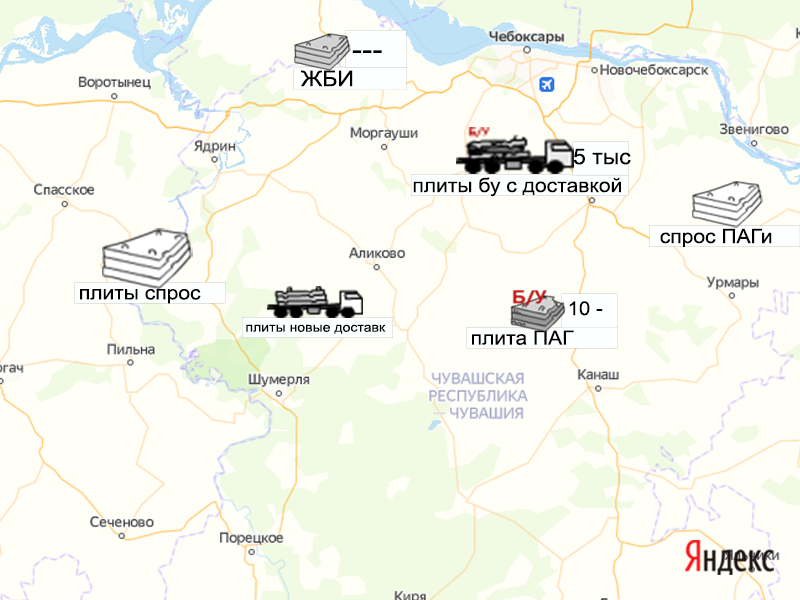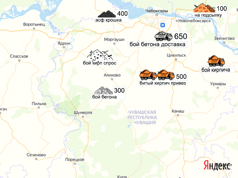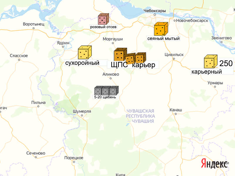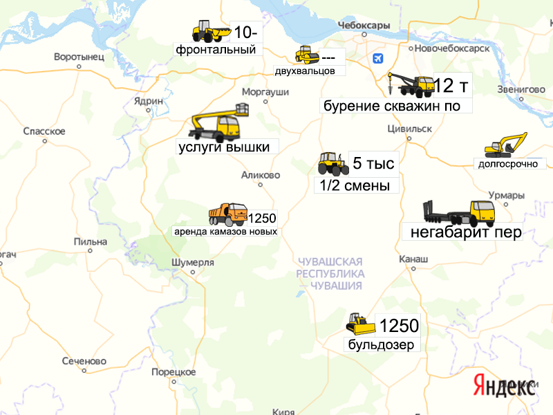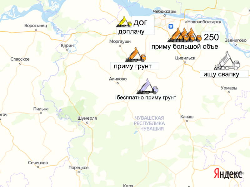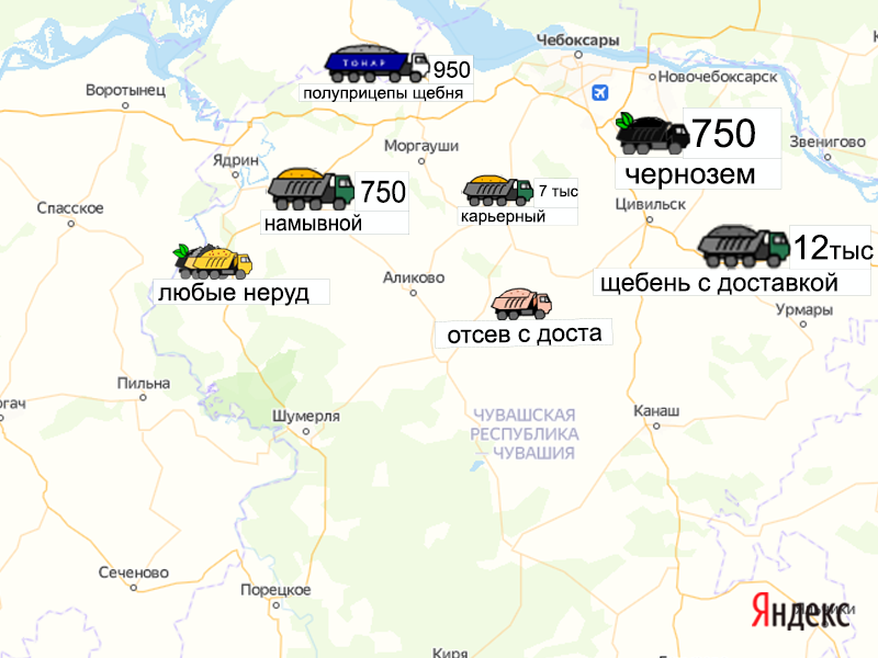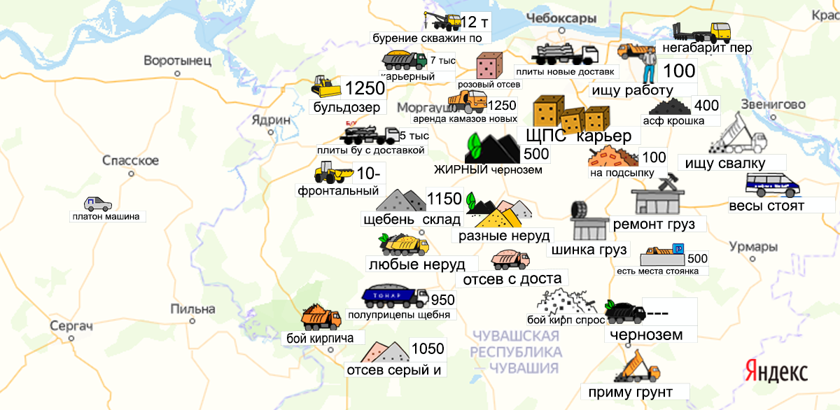 Песок, щебень, техника: объявления на карте в Чувашии
