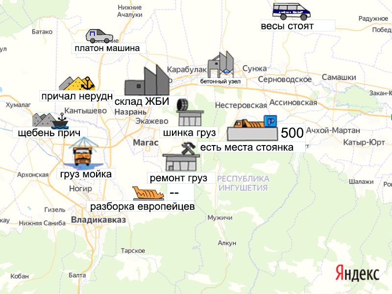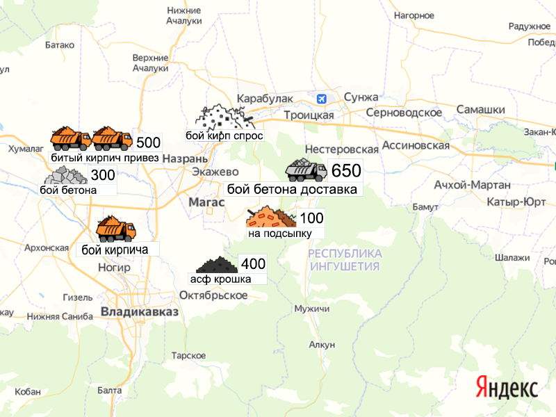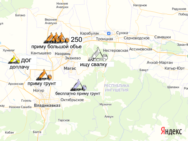 Давайте сделаем для таких покупателей удобным процесс заказа нерудных с доставкой. Эта карта для них. Добавляйте свои самосвалы на карту, сколько стоит какая машина с учетом конкретного места и качества материала и объема кузова.