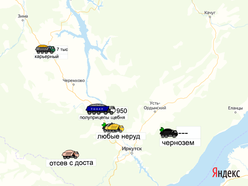 Давайте сделаем для таких покупателей удобным процесс заказа нерудных с доставкой. Эта карта для них. Добавляйте свои самосвалы на карту, сколько стоит какая машина с учетом конкретного места и качества материала и объема кузова.