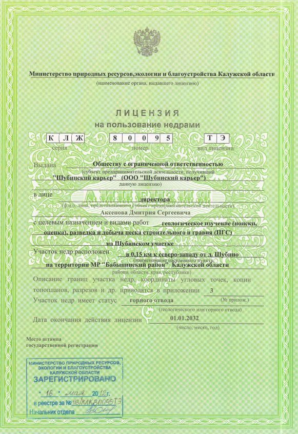Недропользователь ООО "Шубинский Карьер"
