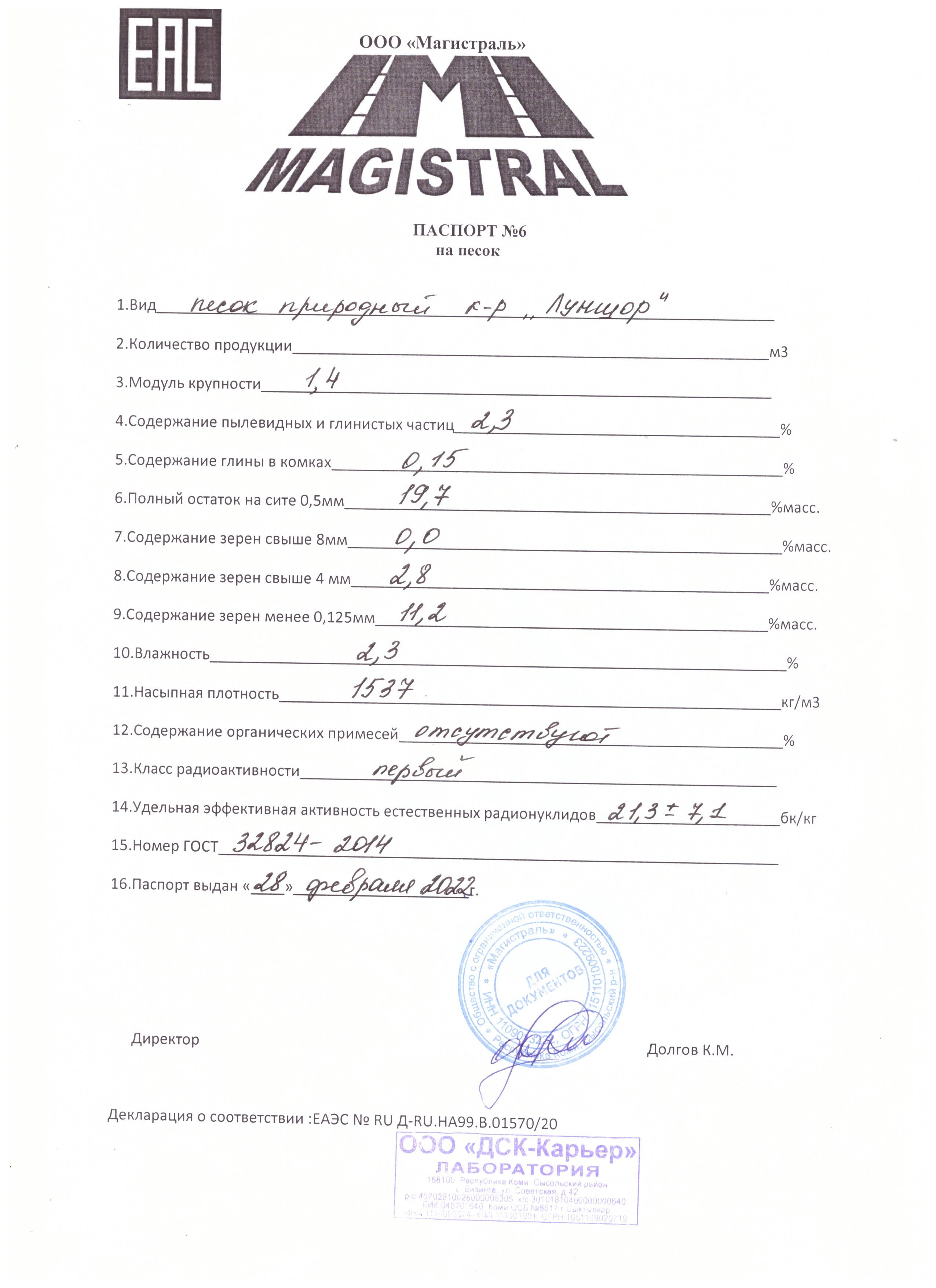 Песок природный МК 1,4 ГОСТ 32824-2014 цена по запросу