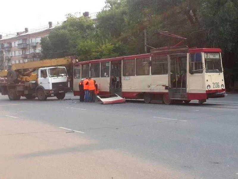 Автокран врезался в трамвай. От удара дверь....