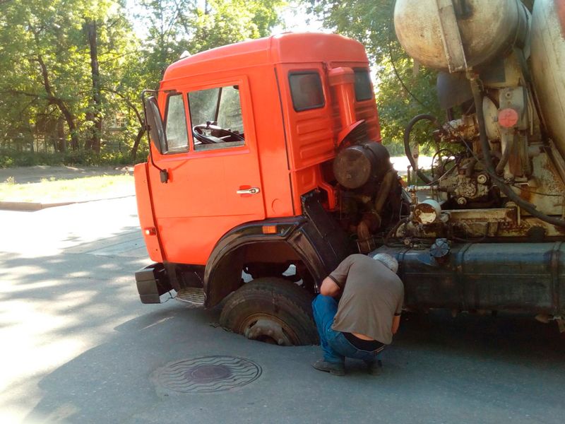 Бетономешалка провалилась в асфальте в Твери. Из-за коммуналь...