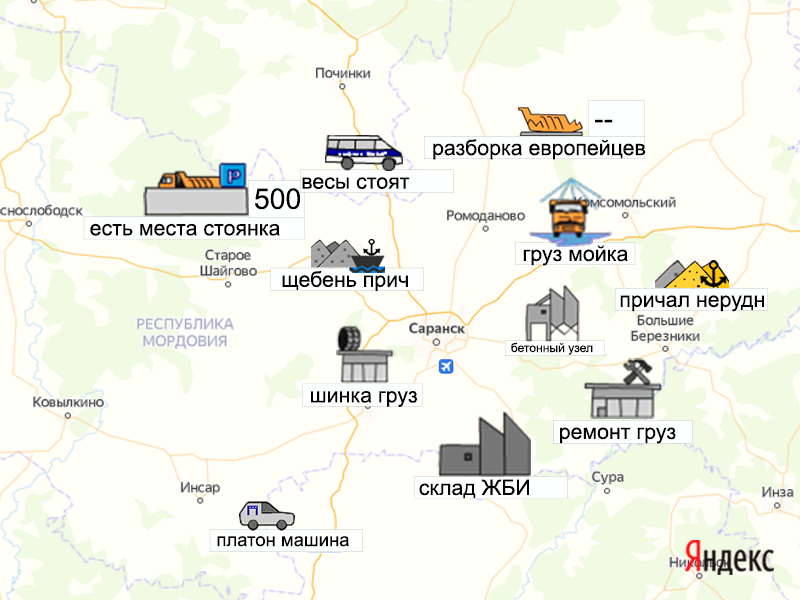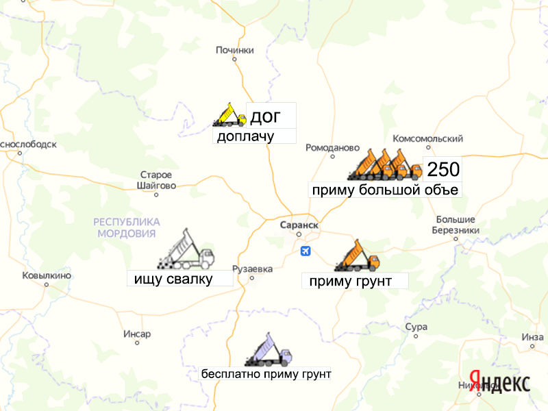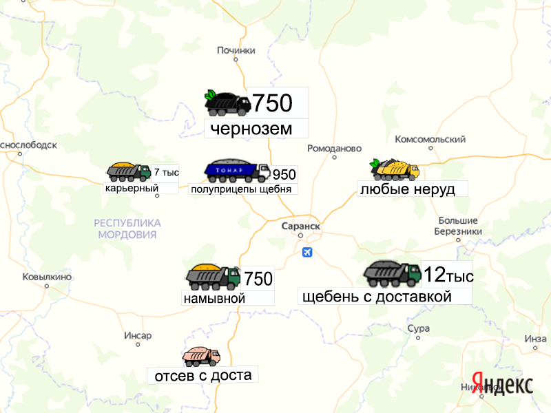 Давайте сделаем для таких покупателей удобным процесс заказа нерудных с доставкой. Эта карта для них. Добавляйте свои самосвалы на карту, сколько стоит какая машина с учетом конкретного места и качества материала и объема кузова.