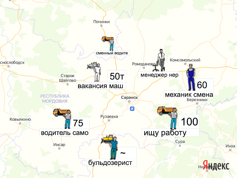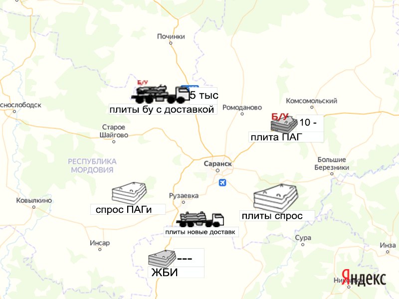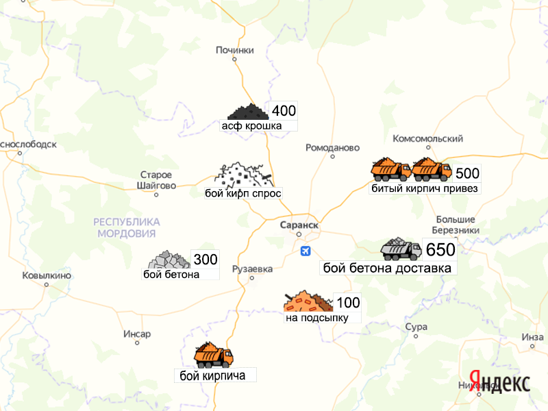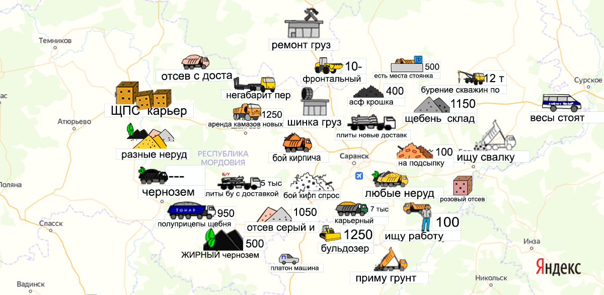 - текст 2: Тут могут быть предложения от карьеров и от всех пользователей. Главное условие - конкретный объем, конкретное качество материала (возможно фото), конкретная цена, конкретное место самовывоза. Общие перечисления всех материалов на карте будут неинформативны и модератор их сразу удалит.