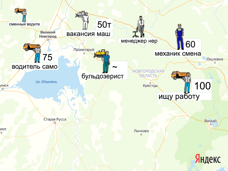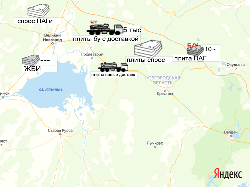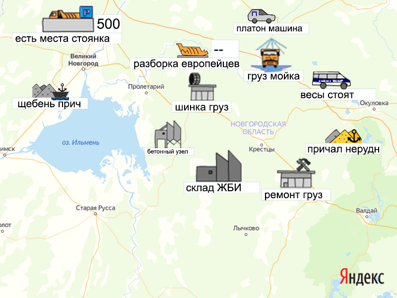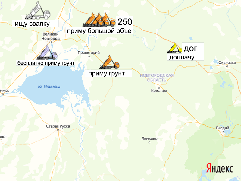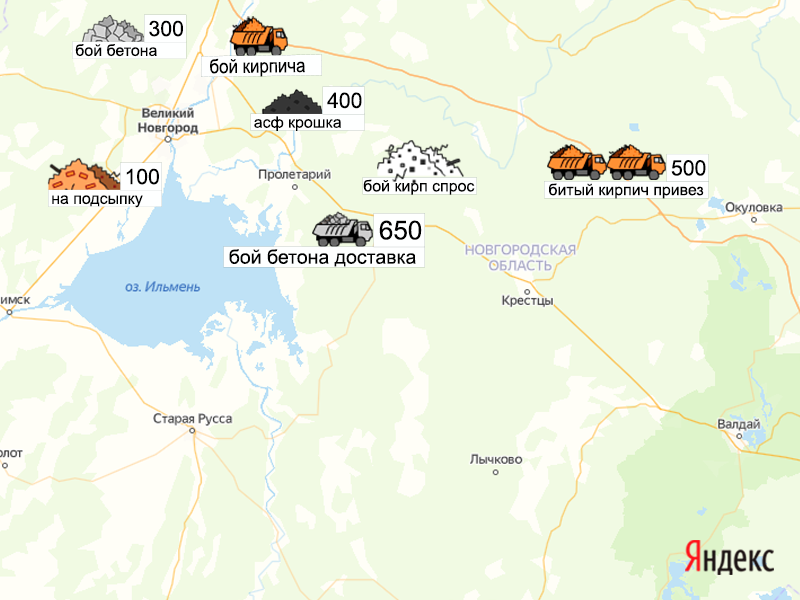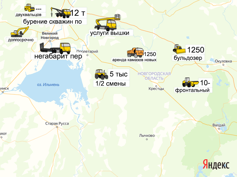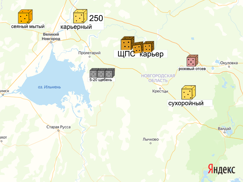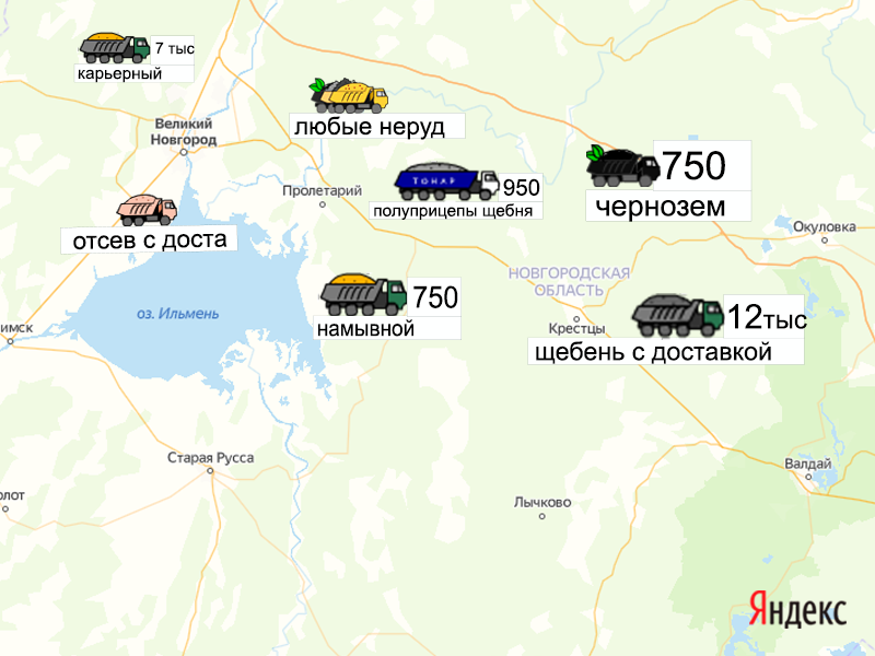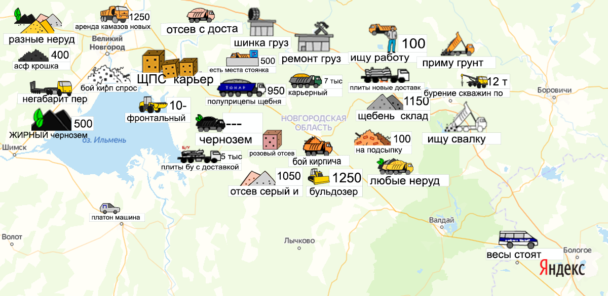 Песок, щебень, техника: объявления на карте в Новгородской области