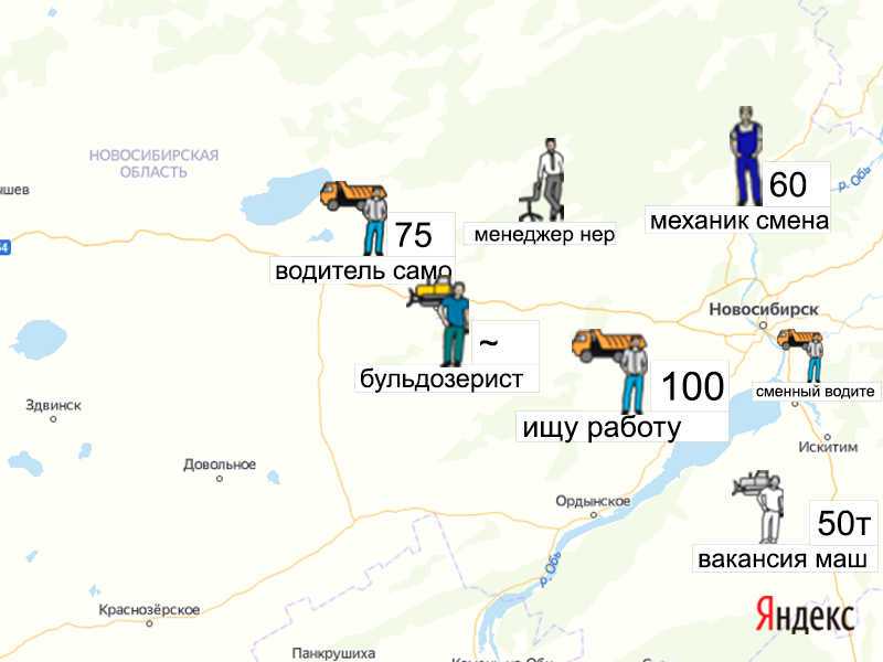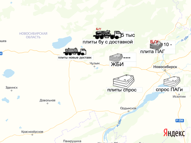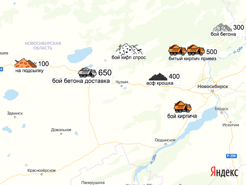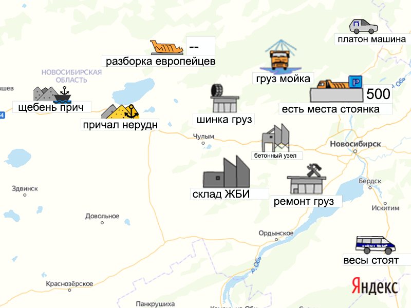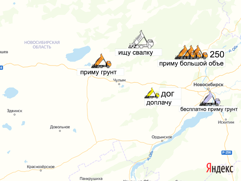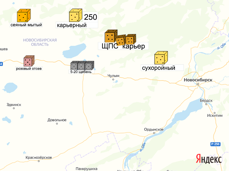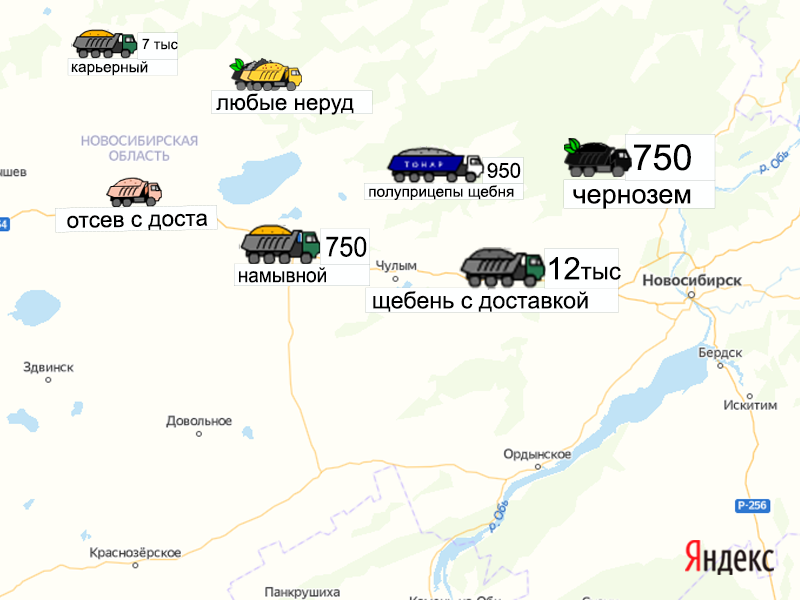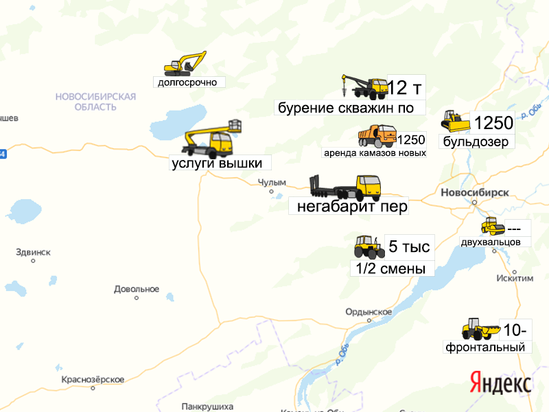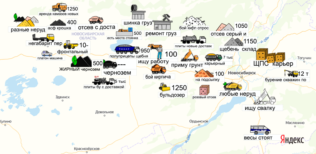 Песок, щебень, техника: объявления на карте в Новосибирской области