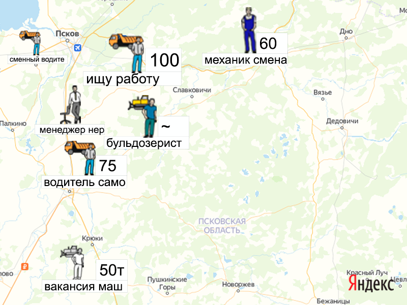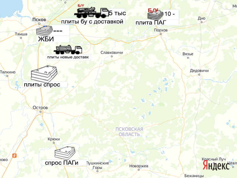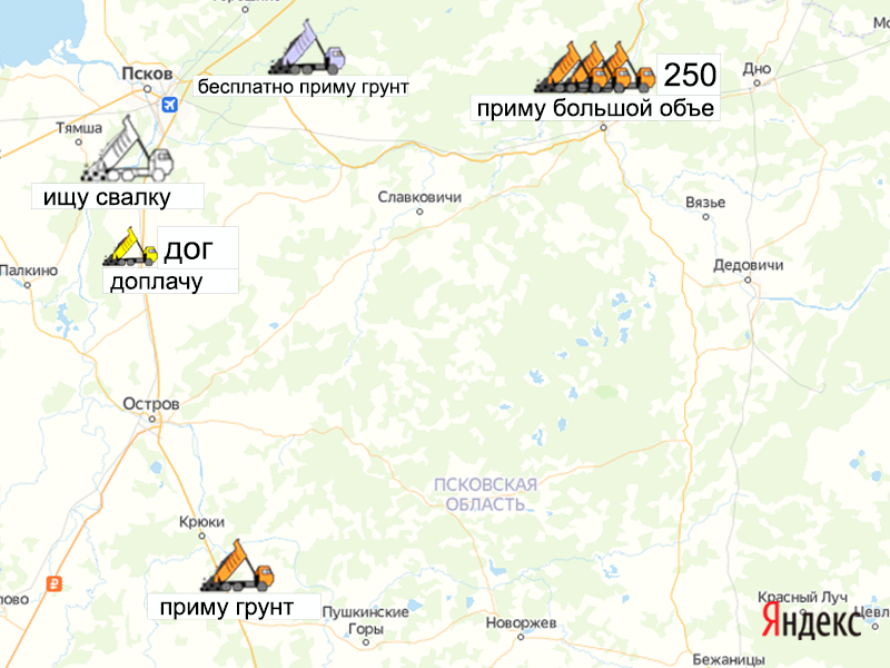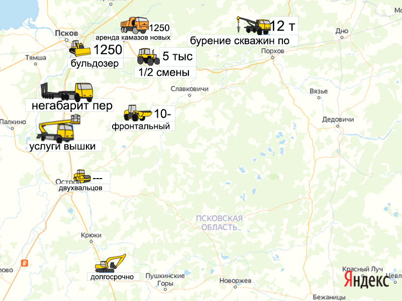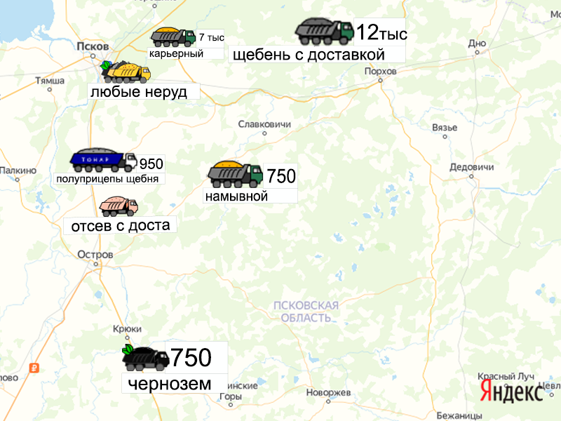 Песок, щебень, техника: объявления на карте в Псковской области