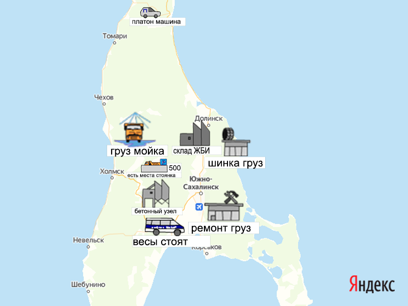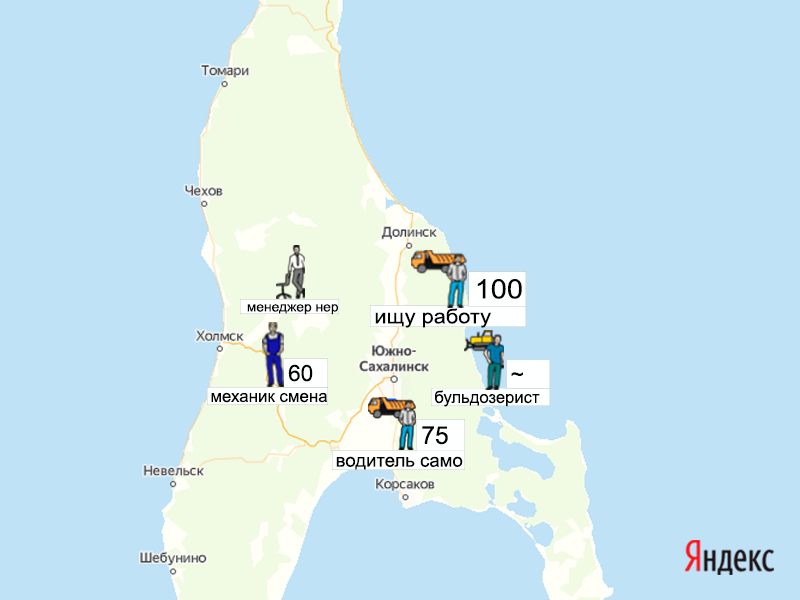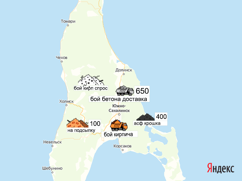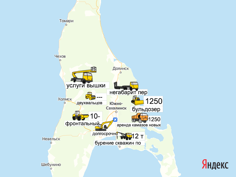 Песок, щебень, техника: объявления на карте в Сахалинской области