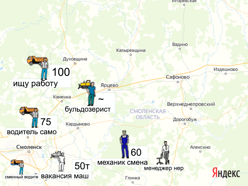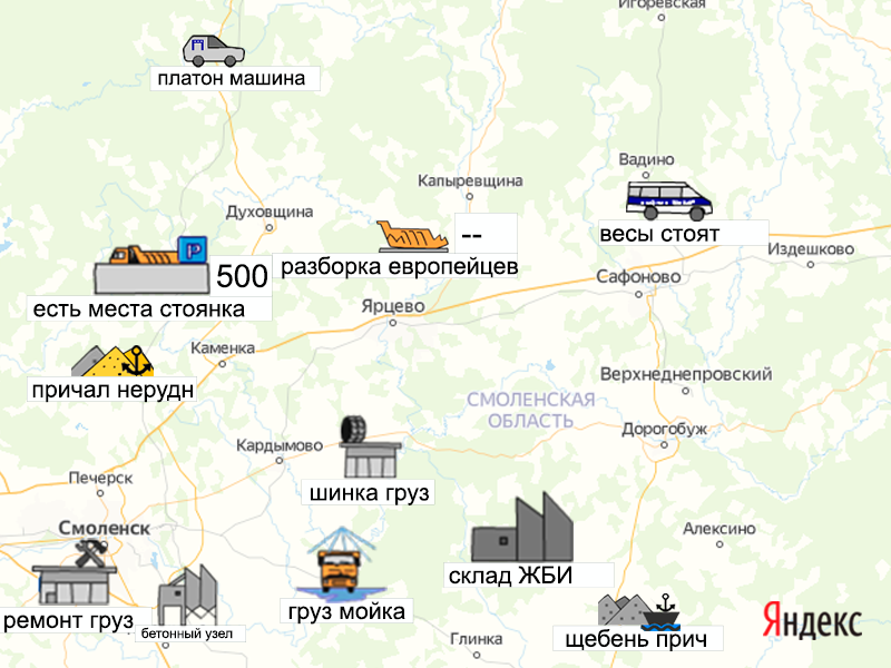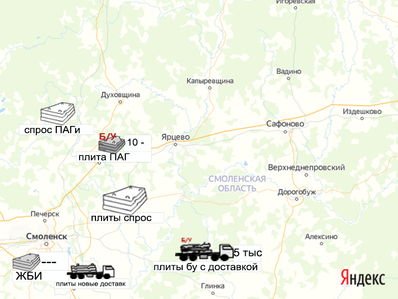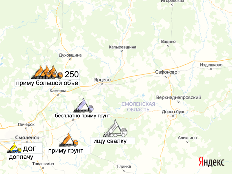 Песок, щебень, техника: объявления на карте в Смоленской области