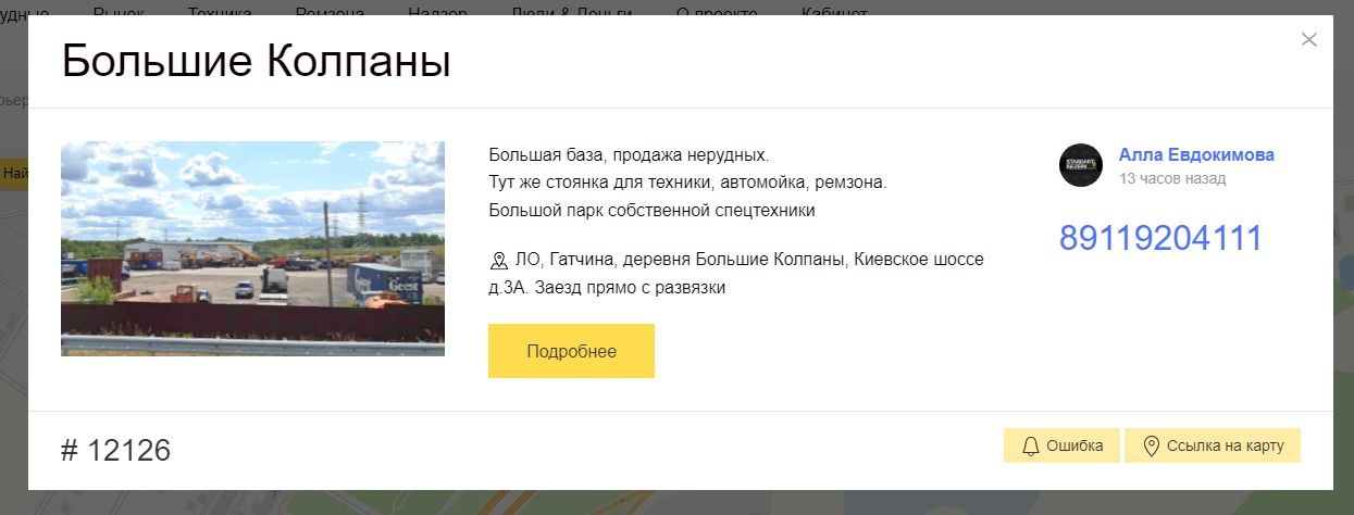 При нажатии на метку открывается карточка с телефоном, ценами, описанием. Все можно менять