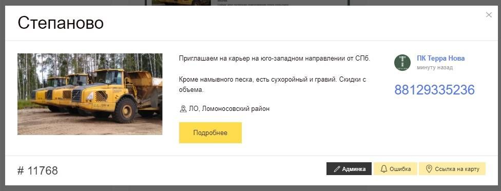 При нажатии на метку открывается карточка с телефоном, ценами, описанием. Все можно менять