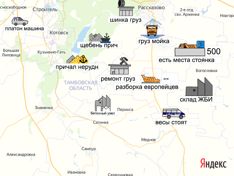 Давайте сделаем для таких покупателей удобным процесс заказа нерудных с доставкой. Эта карта для них. Добавляйте свои самосвалы на карту, сколько стоит какая машина с учетом конкретного места и качества материала и объема кузова.