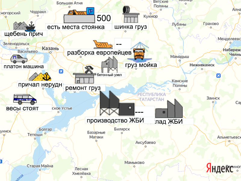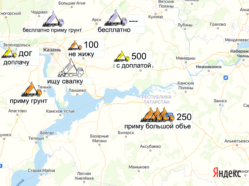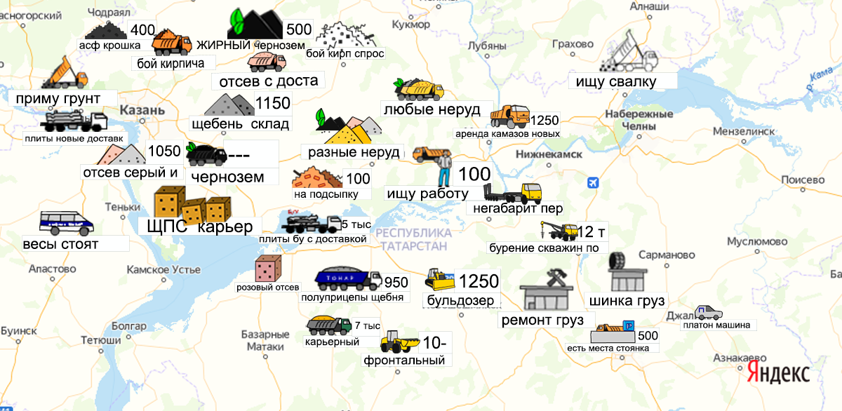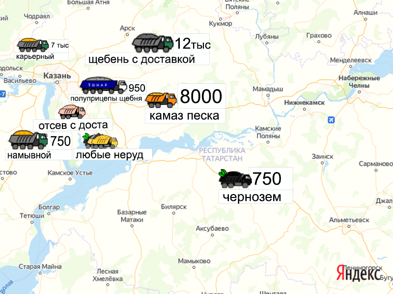 Давайте сделаем для таких покупателей удобным процесс заказа нерудных с доставкой. Эта карта для них. Добавляйте свои самосвалы на карту, сколько стоит какая машина с учетом конкретного места и качества материала и объема кузова.