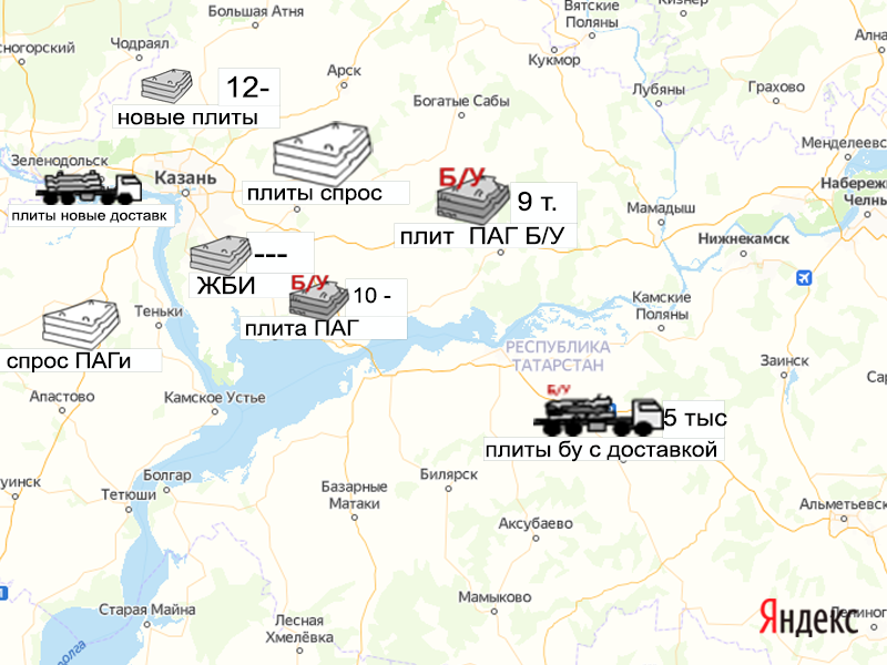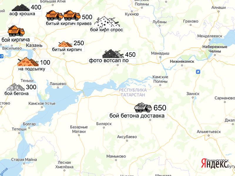 - текст 2: Тут могут быть предложения от карьеров и от всех пользователей. Главное условие - конкретный объем, конкретное качество материала (возможно фото), конкретная цена, конкретное место самовывоза. Общие перечисления всех материалов на карте будут неинформативны и модератор их сразу удалит.