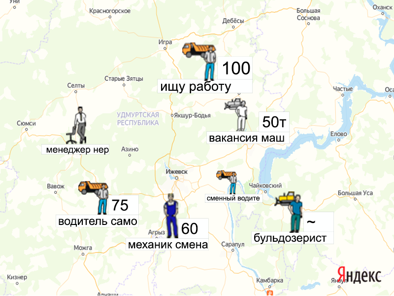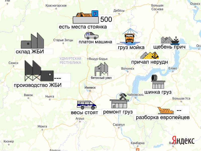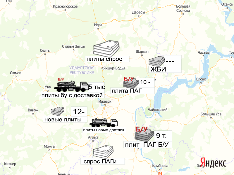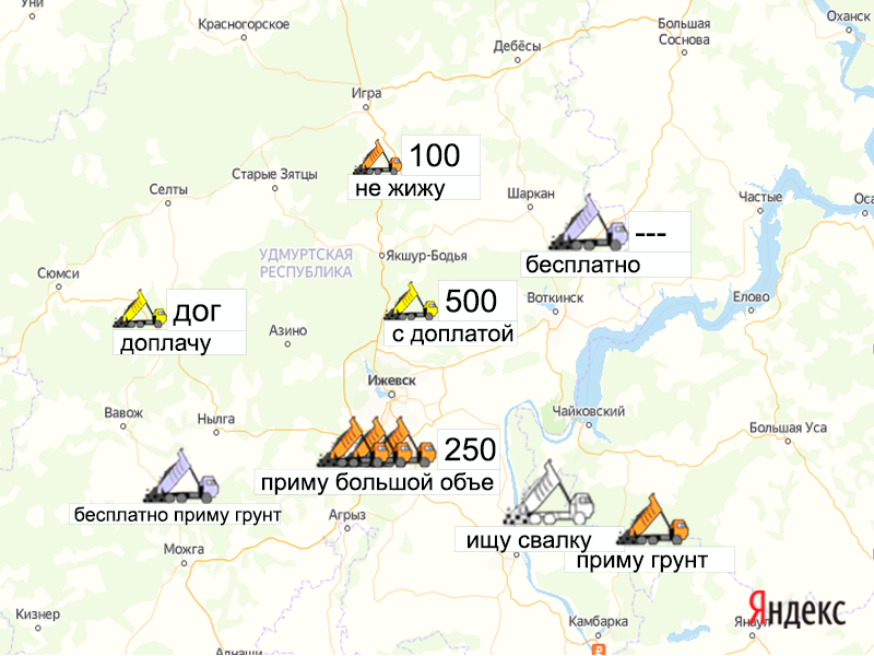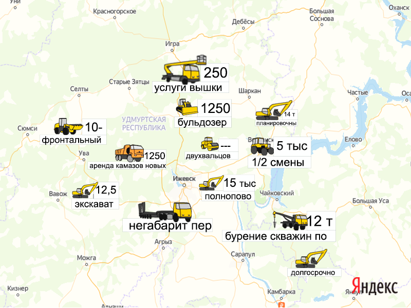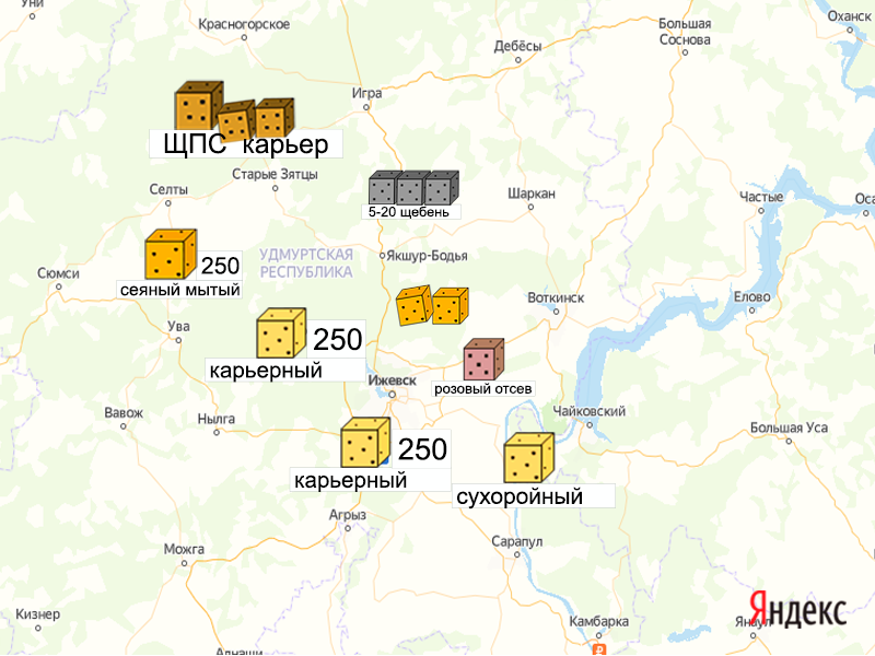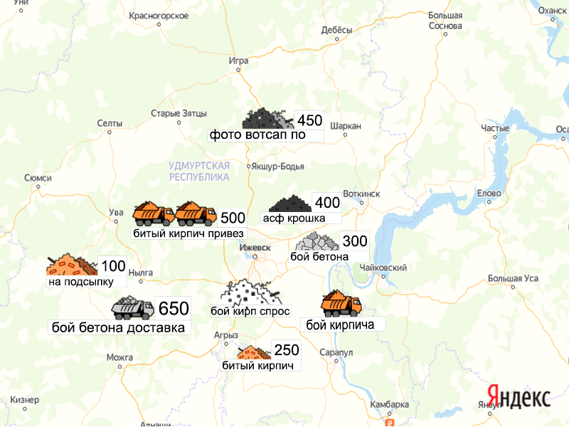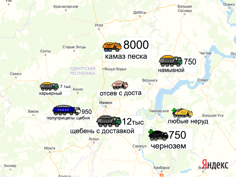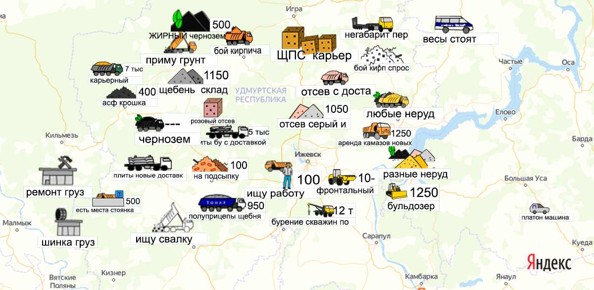 Песок, щебень, техника: объявления на карте в Удмуртии