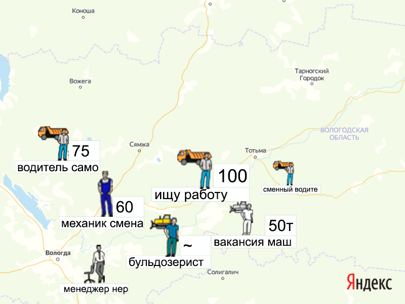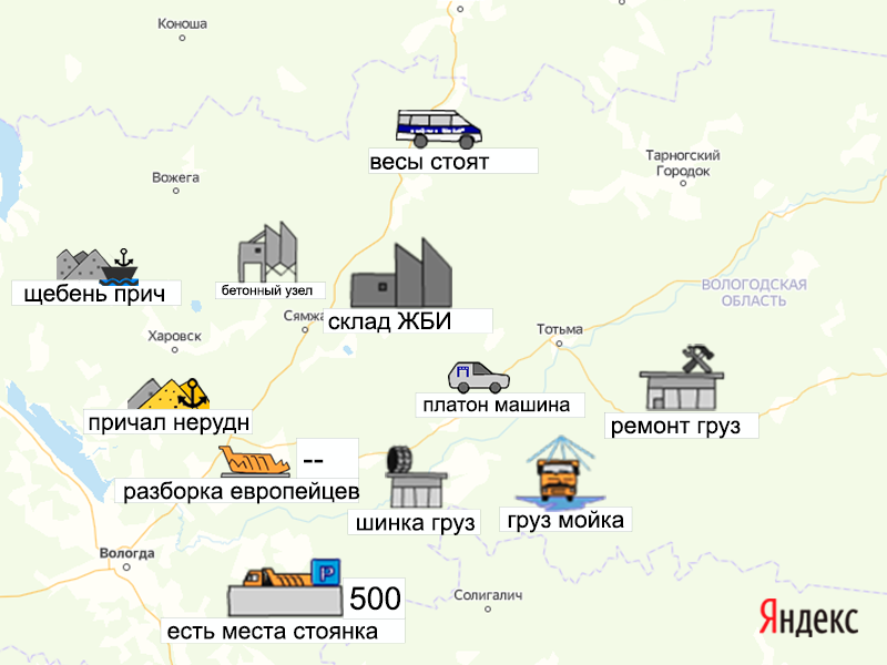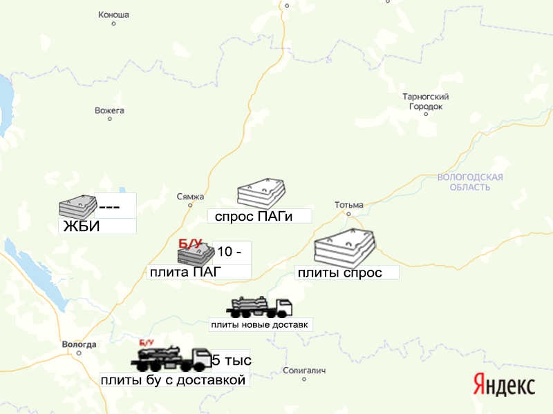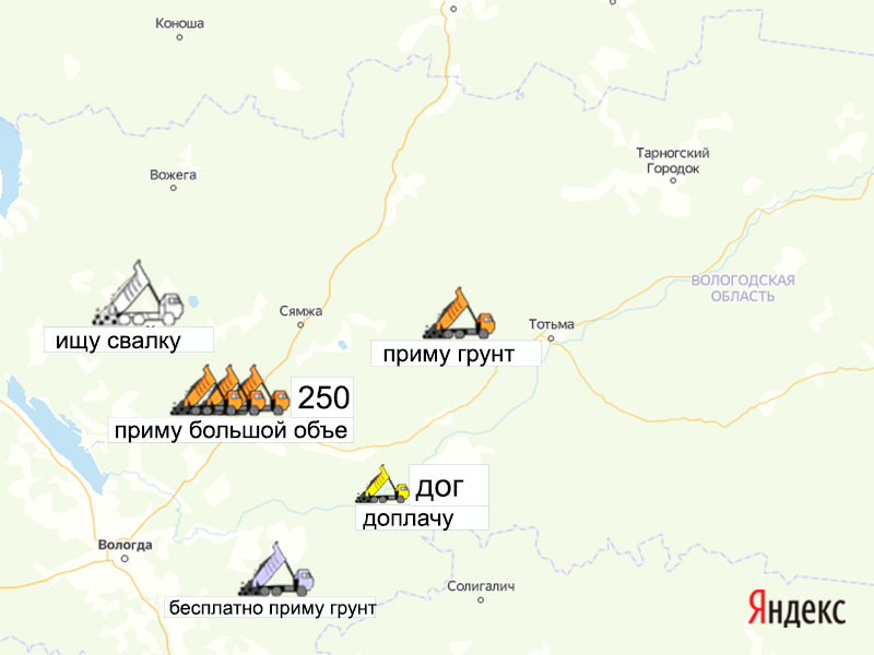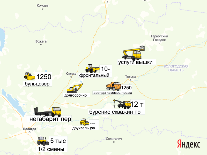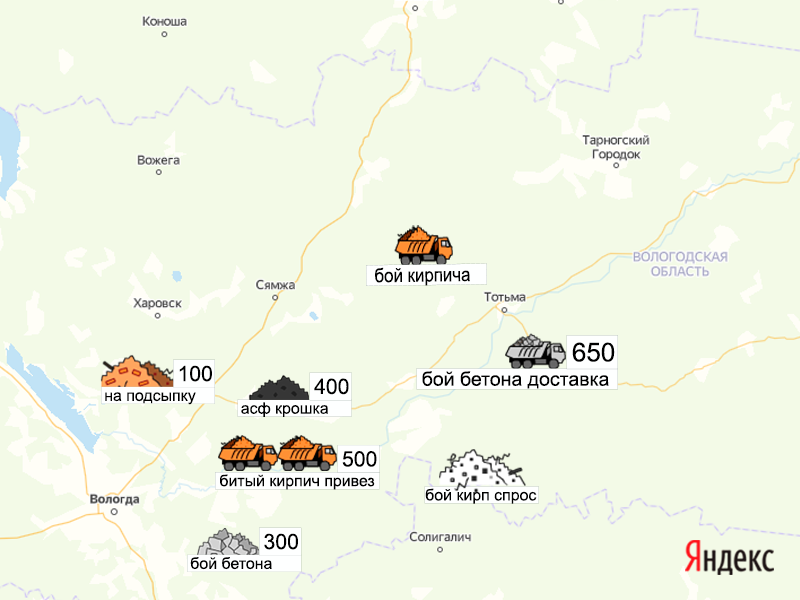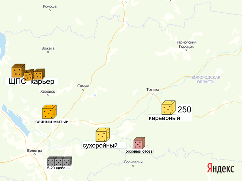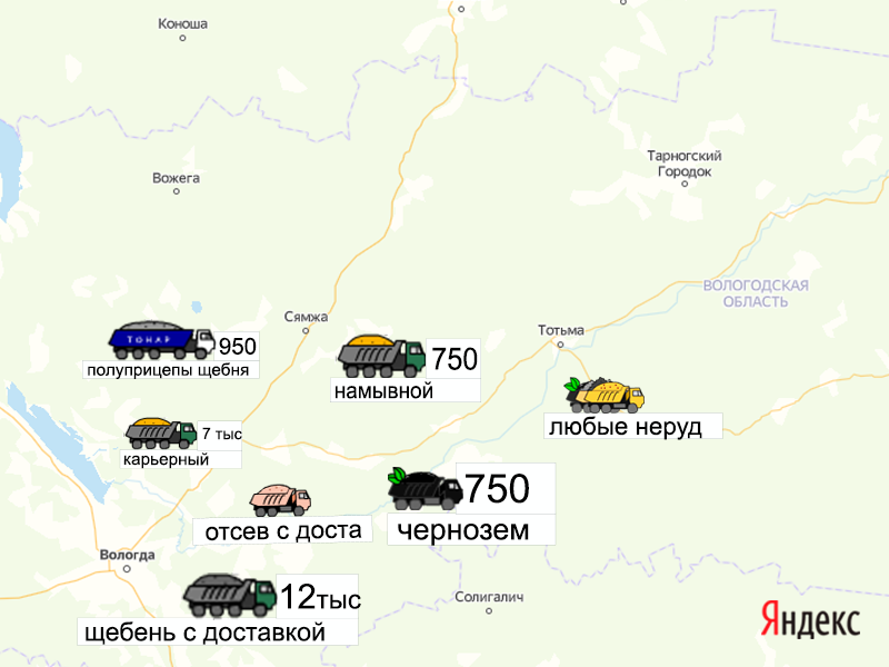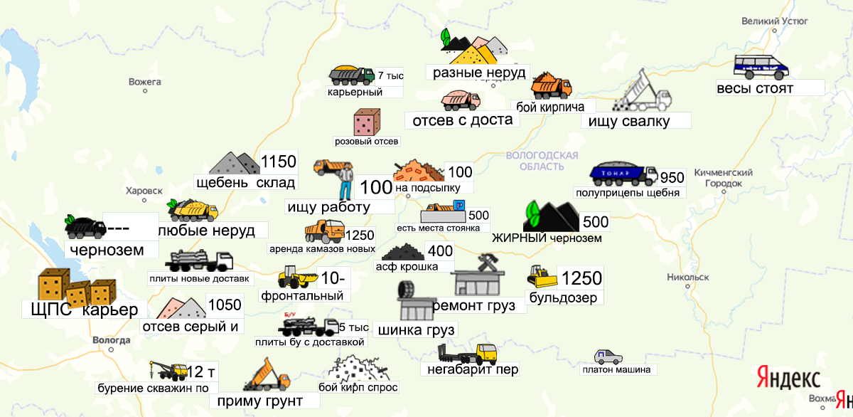 Песок, щебень, техника: объявления на карте в Вологодской области