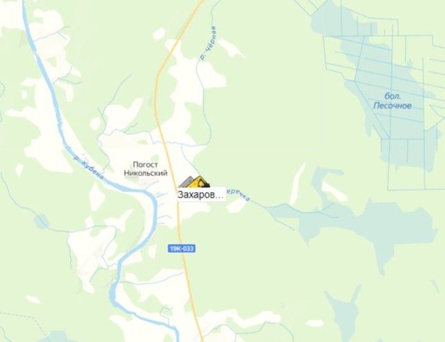 Вологодская область, Харовский район, в 14 км юго-западнее г. Харовска, в 1,5 км западнее автодороги Сокол-Харовск-Вожега