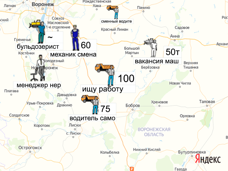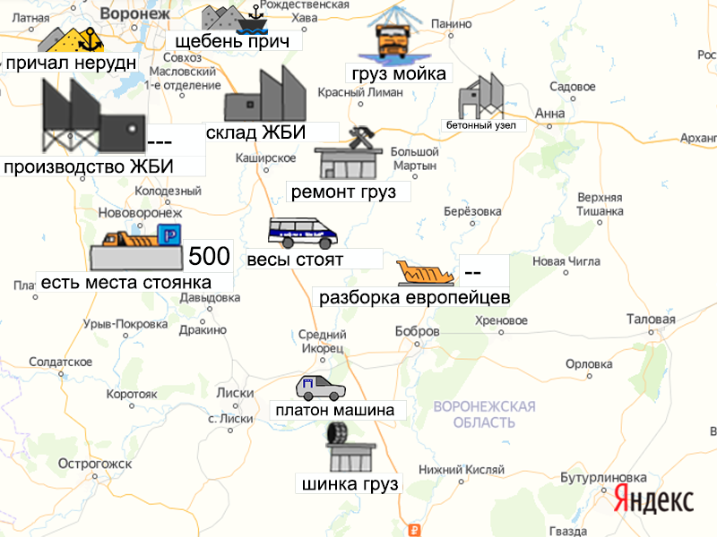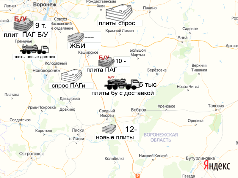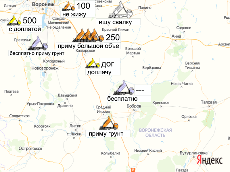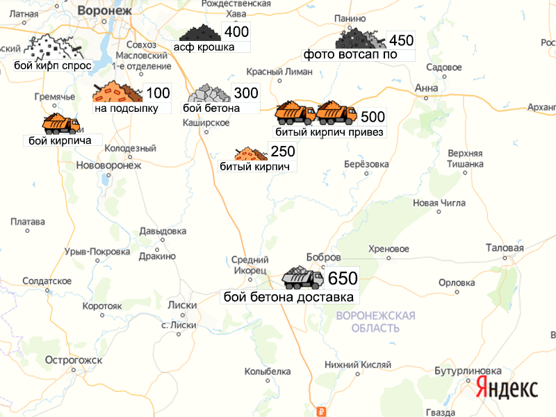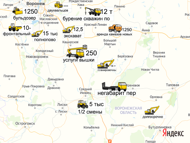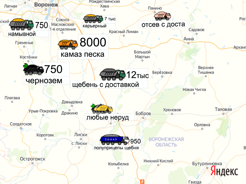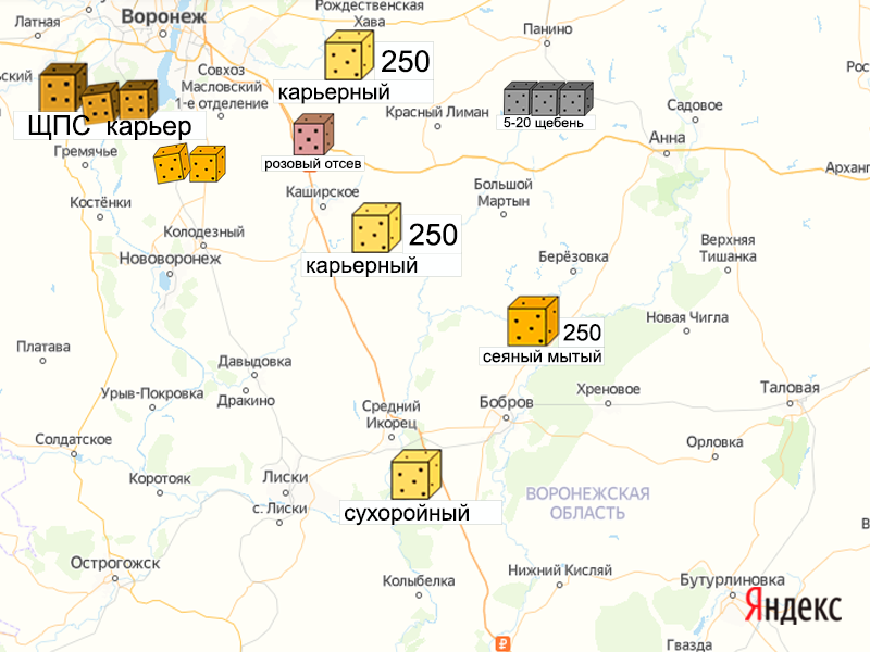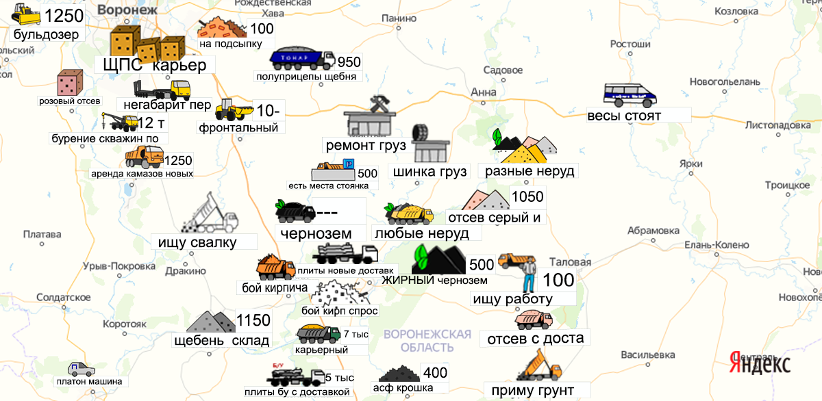 Песок, щебень, техника: объявления на карте в Воронежской области