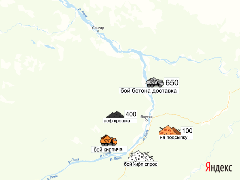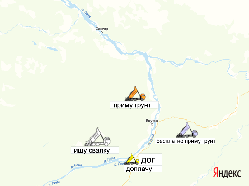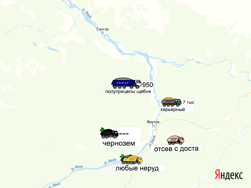 Давайте сделаем для таких покупателей удобным процесс заказа нерудных с доставкой. Эта карта для них. Добавляйте свои самосвалы на карту, сколько стоит какая машина с учетом конкретного места и качества материала и объема кузова.