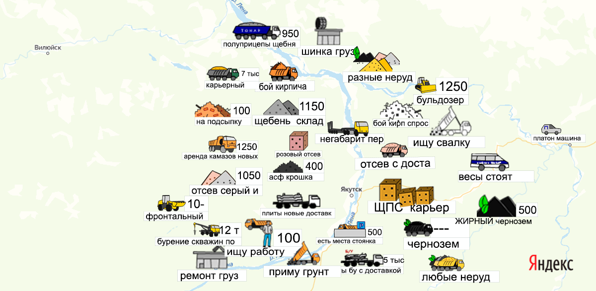 - текст 2: Тут могут быть предложения от карьеров и от всех пользователей. Главное условие - конкретный объем, конкретное качество материала (возможно фото), конкретная цена, конкретное место самовывоза. Общие перечисления всех материалов на карте будут неинформативны и модератор их сразу удалит.