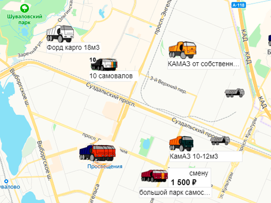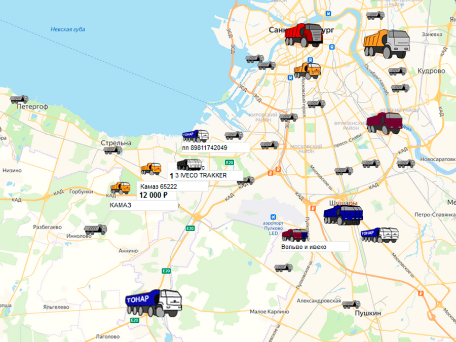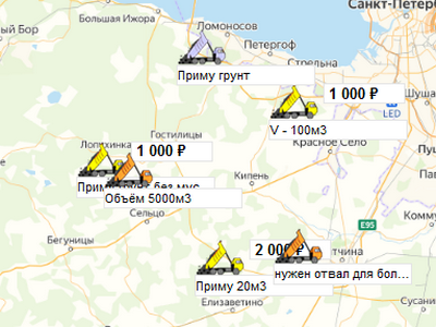 | Метка на карте соответствует машине или автопарку. Цвет, количество, общее впечатление. А фото и текст на карточке можно менять онлайн |